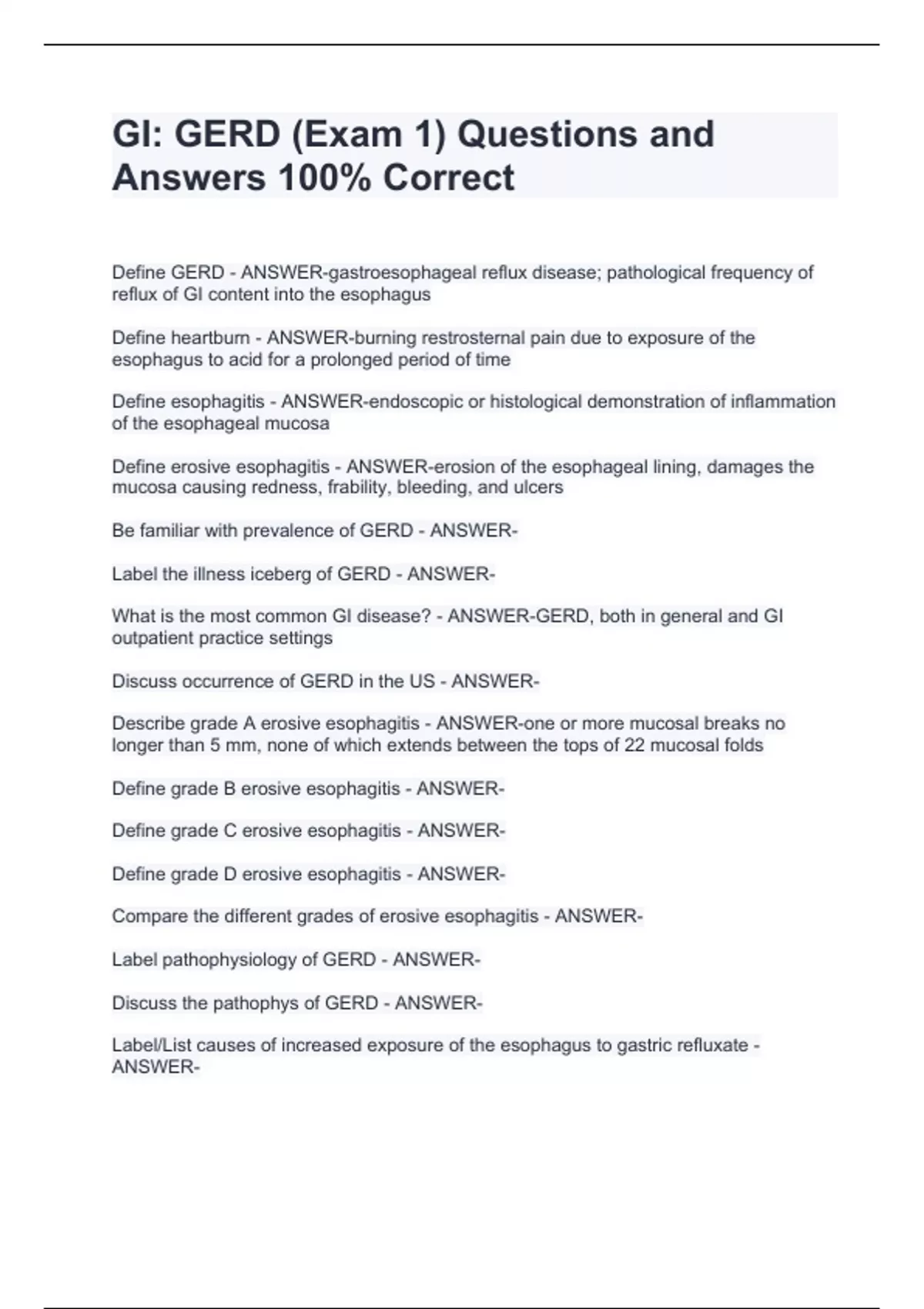 GI: GERD (Exam 1) Questions and Answers 100% Correct GI: GERD (Exam 1) Questions and Answers 100% Correct GI: GERD (Exam 1) Questions and Answers 100% Correct Define GERD - ANSWER-gastroesophageal reflux disease; pathological frequency of reflux of GI content into the esophagus Define heartburn - ANSWER-burning restrosternal pain due to exposure of the esophagus to acid for a prolonged period of time Define esophagitis - ANSWER-endoscopic or histological demonstration of inflammation of the esophageal mucosa Define erosive esophagitis - ANSWER-erosion of the esophageal lining, damages the mucosa causing redness, frability, bleeding, and ulcers