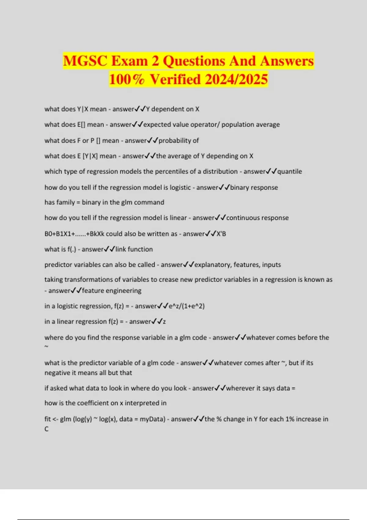 MGSC Exam 2 Questions And Answers 100% Verified 2024/2025 what does Y|X mean - answerY dependent on X what does E[] mean - answerexpected value operator/ population average what does F or P [] mean - answerprobability of what does E [Y|X] mean - answerthe average of Y depending on X which type of regression models the percentiles of a distribution - answerquantile how do you tell if the regression model is logistic - answerbinary response has family = binary in the glm command how do you tell if the regression model is linear - answercontinuous response B0+B1X1+......+BkXk could also be written as - answerX'B what is f(.) - answerlink function predictor variables can also be called - answerexplanatory, features, inputs taking transformations of variables to crease new predictor variables in a regression is known as - answerfeature engineering in a logistic regression, f(z) = - answere^z/(1+e^2) in a linear regression f(z) = - answerz where do you find the response variable in a glm code - answerwhatever comes before the ~ what is the predictor variable of a glm code - answerwhatever comes after ~, but if its negative it means all but that if asked what data to look in where do you look - answerwherever it says data = how is the coefficient on x interpreted in fit <- glm (log(y) ~ log(x), data = myData) - answerthe % change in Y for each 1% increase in C