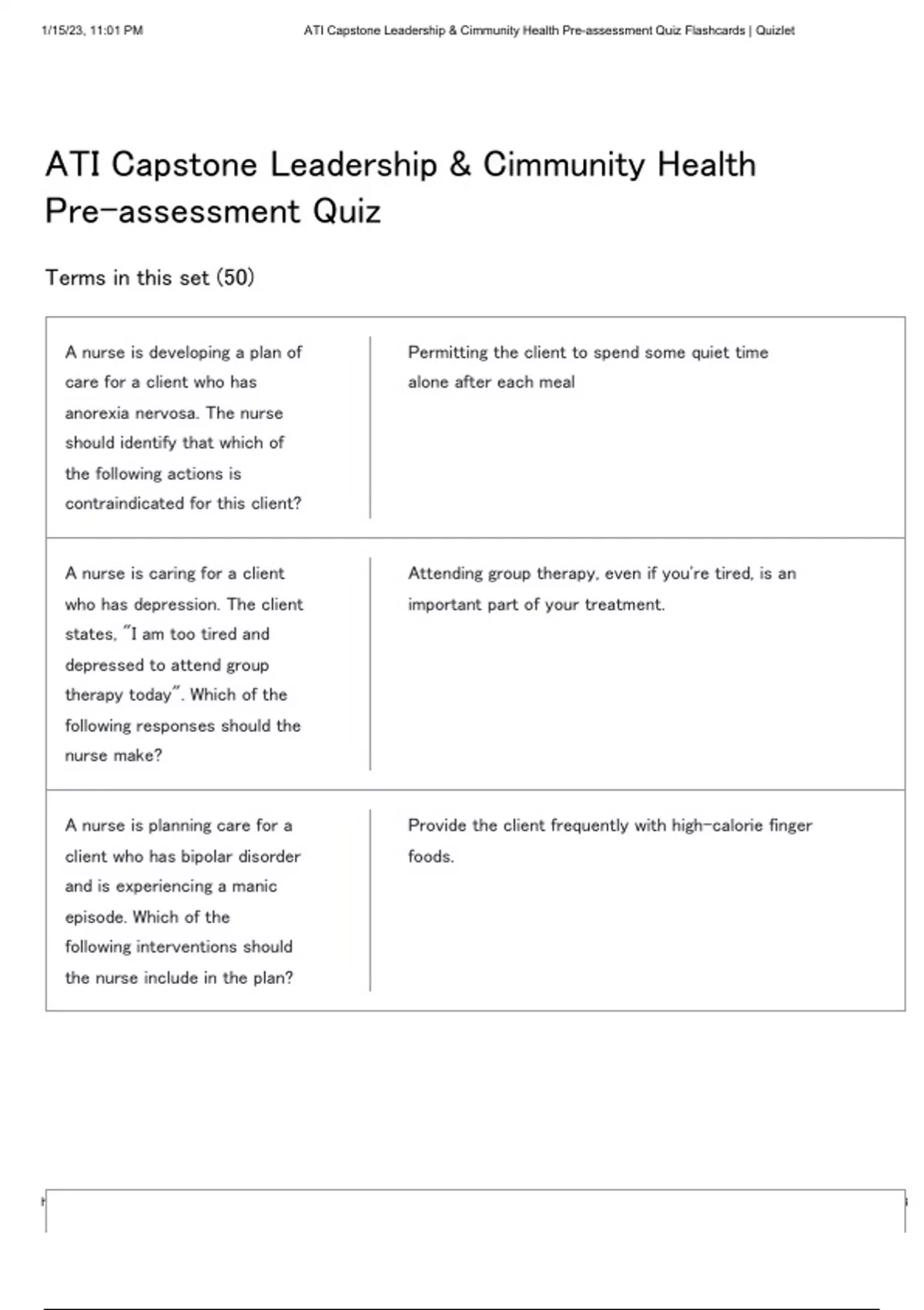 Terms in this set (50) A nurse is developing a plan of care for a client who has anorexia nervosa. The nurse should identify that which of the following actions is contraindicated for this client? Permitting the client to spend some quiet time alone after each meal A nurse is caring for a client who has depression. The client states, "I am too tired and depressed to attend group therapy today". Which of the following responses should the nurse make? Attending group therapy, even if you're tired, is an important part of your treatment. A nurse is planning care for a client who has bipolar disorder and is experiencing a manic episode. Which of the following interventions should the nurse include in the plan? Provide the client frequently with high-calorie finger foods. 1/15/23, 11:01 PM ATI Capstone Leadership & Cimmunity Health Pre-assessment Quiz Flashcards | Quizlet A nurse is caring for a client who has alcohol use disorder. Following alcohol withdrawal, which of the following medications should the nurse expect to administer to the client during maintenance? Disulfiram A nurse is caring for a newly admitted client who is receiving treatment for alcohol disorder. The client tells the nurse, "I have not had anything to drink for 6 hours". Which of the following findings should teh nurse expect during alcohol withdrawal? Insomnia A nurse is caring for a client who has Alzheimer's disease and a new prescription for donepezil. Which of the following actions should the nurse take? Administer the medication at bedtime A nurse is providing teaching to a client who has a new prescription for disulfiram for the management of alcohol dependence. Which of the following dietary choices should the nurse instruct the client to avoid? pure vanilla extract 1/15/23, 11:01 PM ATI Capstone Leadership & Cimmunity Health Pre-assessment Quiz Flashcards | Quizlet A nurse is assessing a client who has Stage 4 Alzheimer's disease. Which of the following findings should teh nurse expect? the client is available to identify the names of family members A nurse is providng teaching to the parents of a school-age child who has ADHD. Which of the following instructions should the nurse include in the teaching? Ignore your child's attention-seeking behaviors that are not dangerous A nurse in an emergency room is assessing a client who has cocaine intoxication. Which of the following findings should the nurse expect? Dilated pupils A nurse is assessing a client who has binge-eating disorder. Which of the following findings should the nurse expect? Abdominal pain A nurse is assessing a client who has conduct disorder. Which of the following findings should the nurse expect? Aggressive behavior toward others A nurse is interviewing an older adult client about possible abuse by her caregiver. Which of the following techniques should the nurse use? Maintain a nonjudgmental tone 1/15/23, 11:01 PM ATI Capstone Leadership & Cimmunity Health Pre-assessment Quiz Flashcards | Quizlet A nurse in an acute mental health facility is reviewing the medication records for a group clients. The nurse should expect a prescription for memantine for a client who has which of the following diagnoses? severe Alzheimer's disease