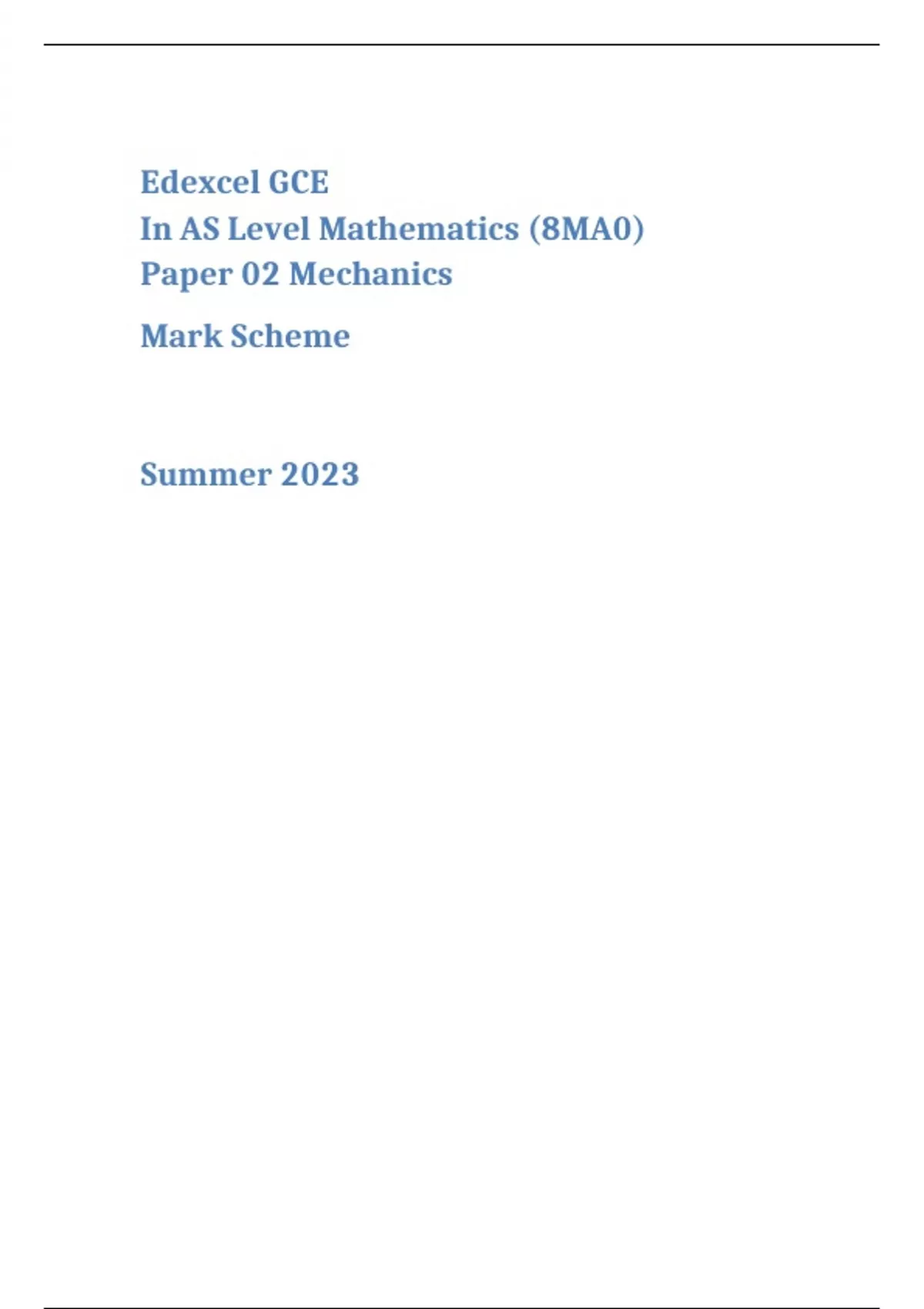 Edexcel GCE In AS Level Mathematics (8MA0) Paper 02 Mechanics Mark Scheme Summer 2023