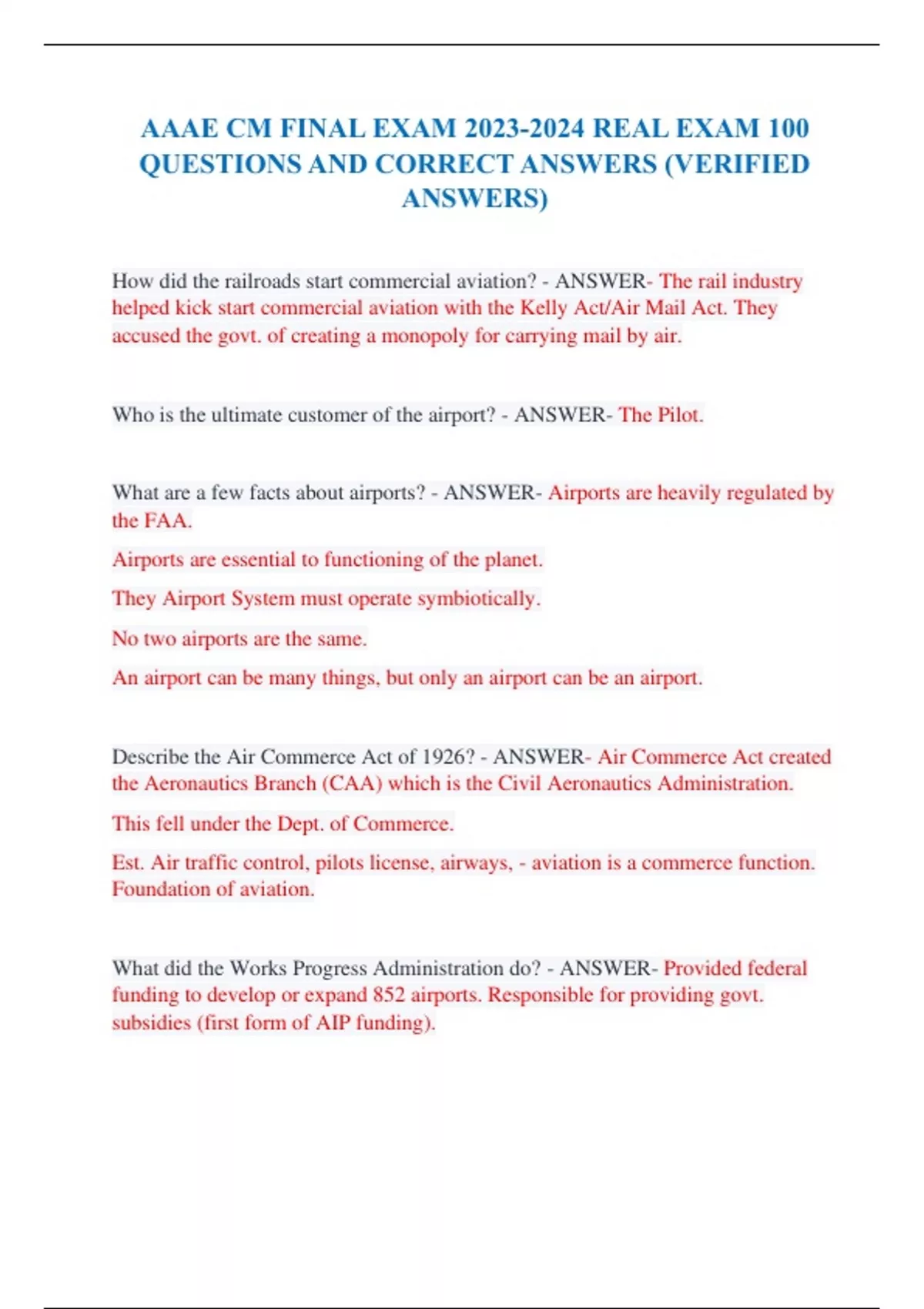 AAAE CM FINAL EXAM REAL EXAM 100 QUESTIONS AND CORRECT ANSWERS (VERIFIED ANSWERS) How did the railroads start commercial aviation? - ANSWER- The rail industry helped kick start commercial aviation with the Kelly Act/Air Mail Act. They accused the govt. of creating a monopoly for carrying mail by air. Who is the ultimate customer of the airport? - ANSWER- The Pilot. What are a few facts about airports? - ANSWER- Airports are heavily regulated by the FAA. Airports are essential to functioning of the planet. They Airport System must operate symbiotically. No two airports are the same. An airport can be many things, but only an airport can be an airport. Describe the Air Commerce Act of 1926? - ANSWER- Air Commerce Act created the Aeronautics Branch (CAA) which is the Civil Aeronautics Administration. This fell under the Dept. of Commerce. Est. Air traffic control, pilots license, airways, - aviation is a commerce function. Foundation of aviation. What did the Works Progress Administration do? - ANSWER- Provided federal funding to develop or expand 852 airports. Responsible for providing govt. subsidies (first form of AIP funding). What was the CAB (Civil Aeronautics Board) in charge of? - ANSWER- CAB was charged with making rules, conducting accidents and the economic regulation of the airlines. They economically regulated aviation. What is DLAND (Development of Landing Areas of National Defense)? - ANSWER- After WWII, 500 airports were declared surplus and given to cities because they could afford them. Promise to make the airport available for PUBLIC use (early start of Grant Assurances). Which act created the FAA? - ANSWER- Federal Aviation Act of 1958 also known as the Jet Age. It's main reason was to make it safer b/c there was too many mid-air collisions. What did the Airport & Airway Dev. Act of 1970 do? - ANSWER- Filled gaps in the system, expanded the list of projects available for aid, created FAR Part 139 Cert. and created the Aviation Trust Fund. What is the Aviation Trust Fund? - ANSWER- A tax collected to fund aviation with the premise only those who use aviation should pay for it. How did deregulation affect the airline industry? - ANSWER- It ended regulation of the airlines, deregulation created the hub and spoke system allowing airlines to fly where they want without restrictions (Fed Ex model). Which act created the TSA? - ANSWER- The Aviation and Transportation Security Act (2001) after the attacks of 9/11. Describe what the Airport Improvement Act of 1982 does? - ANSWER- Created the NPIAS and AIP Funding (capital projects) and est. airport categories. What is NextGen? - ANSWER- Overhaul of our entire aviation system - affecting everyone. What started private companies to offer space commercialization's? - ANSWER- When Shuttle Atlantis lands, ending the US Space shuttle program. What are the challenges facing our industry in the future? - ANSWER- Security measures, NextGen, UAV operations - trying to keep up with them. What do air carriers desire? - ANSWER- Access to good market, lower operating costs and influence over key airport decisions. Air carriers are your most significant tenant. What is the difference between and FBO and a SASO? - ANSWER- An FBO can provide fuel, SASO's can not. Which airports can be in the NPIAS? - ANSWER- Airports who are publicly accessible. Receive more then 2500 annual enplanements or are a qualified GA airport, Relieve airports, Bases or airports with a postal contract. What are the three methods to measure airport activity? - ANSWER- Enplanements: a passenger boarding commercial Operation: Aircraft taking off or landing Cargo: measured in tonnage What is the difference between a local operation and an itinerant operation? - ANSWER- A local operation is within 20 miles of the airport, itinerant is outside of the airport area and uses Instrument Flight Rules or Visual Flight Rules. How many Airports are in the NPIAS? - ANSWER- 3,300 What type of airport must have at least 25,000 itinerant aircraft or 100 based aircraft? - ANSWER- GA Reliever Airport How many annual enplanements must an airport have for commercial service? - ANSWER- 2,500 How many enplanements are needed to be a Primary commercial service airport? - ANSWER- 10,000 Who makes up for 70% of all passenger traffic? - ANSWER- Large Hub Airports "Big 30" What's the qualifier for non-hub airports and non-primary? - ANSWER- More GA then Commercial, Commercial still has more then 10,000 enplanements. NonHub/Non-primary are predominately GA airports or commercial service with less then 2500 enplanements. What is a joint-use airport? - ANSWER- Joint Use is entirely owned by the DOD, they lease space to civilian. Shared use of the airfield. What is shared-use airport? - ANSWER- Govt. owned, co-located with a civil airport, share portions of the runway/taxiways. What is Part 91? - ANSWER- General Aviation (private) not commercial & not military Part 119 exceptions - ANSWER- Student Instruction, nonStop air Tours, ferry flights, aerial work, 25-SM nonStop parachute ops, 25 SM flight with max two passengers, external loads, emergency mail service, ops under 91.321, small UAS ops. 119- basic requirements What is the importance of Part 91, 121 and 135 - ANSWER- Part 91 - General Aviation/ Private Part 121 - Scheduled Commercial Aircraft Part 135 - Charter What is a public charter? - ANSWER- company contracts for the operation of an aircraft to and from a destination What items are pilots required to check before flying - ANSWER- Pilots must check the complete visual inspections of the aircraft, test emergency and safety systems, configure the GPS and instrumentation, check the weather, routing, and weight & balance Pilots check the Airport Facility Directory - now called Chart supplements. What does Grant Assurance #19 Operations & Maintenance require the airport to do? - ANSWER- Operated in a Safe and Serviceable condition Why does the FAA encourage airports to have minimum standards? - ANSW