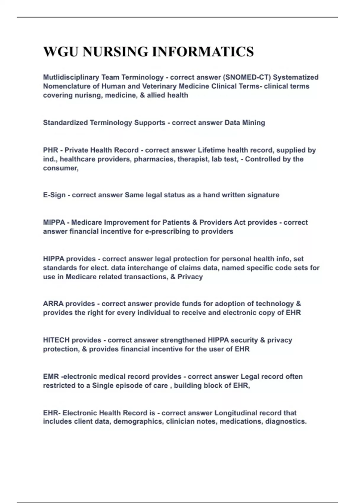 WGU online nursing informatics master's degree program (RN to MSN) WGU NURSING INFORMATICS WGU online nursing informatics master's degree program (RN to MSN) Mutlidisciplinary Team Terminology - correct answer (SNOMED-CT) Systematized Nomenclature of Human and Veterinary Medicine Clinical Terms- clinical terms covering nurisng, medicine, & allied health Standardized Terminology Supports - correct answer Data Mining PHR - Private Health Record - correct answer Lifetime health record, supplied by ind., healthcare providers, pharmacies, therapist, lab test, - Controlled by the consumer, E-Sign - correct answer Same legal status as a hand written signature Mutlidisciplinary Team Terminology - correct answer (SNOMED-CT) Systematized Nomenclature of Human and Veterinary Medicine Clinical Terms- clinical terms covering nurisng, medicine, & allied health Standardized Terminology Supports - correct answer Data Mining PHR - Private Health Record - correct answer Lifetime health record, supplied by ind., healthcare providers, pharmacies, therapist, lab test, - Controlled by the consumer, E-Sign - correct answer Same legal status as a hand written signature WGU NURSING INFORMATICS Mutlidisciplinary Team Terminology - correct answer (SNOMED-CT) Systematized Nomenclature of Human and Veterinary Medicine Clinical Terms- clinical terms covering nurisng, medicine, & allied health Standardized Terminology Supports - correct answer Data Mining PHR - Private Health Record - correct answer Lifetime health record, supplied by ind., healthcare providers, pharmacies, therapist, lab test, - Controlled by the consumer,