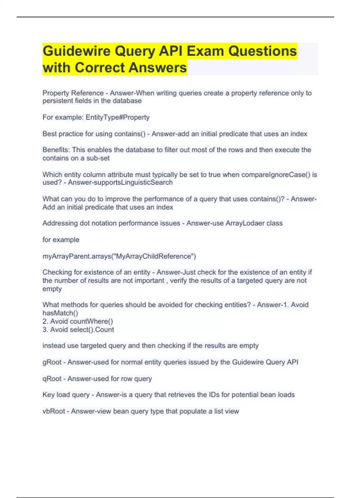 Guidewire Query API Exam Questions with Correct Answers Addressing dot notation performance issues - Answer-use ArrayLodaer class for example myArrayPs("MyArrayChildReference") Checking for existence of an entity - Answer-Just check for the existence of an entity if the number of results are not important , verify the results of a targeted query are not empty What methods for queries should be avoided for checking entities? - Answer-1. Avoid hasMatch() 2. Avoid countWhere() 3. Avoid select().Count instead use targeted query and then checking if the results are empty gRoot - Answer-used for normal entity queries issued by the Guidewire Query API qRoot - Answer-used for row query