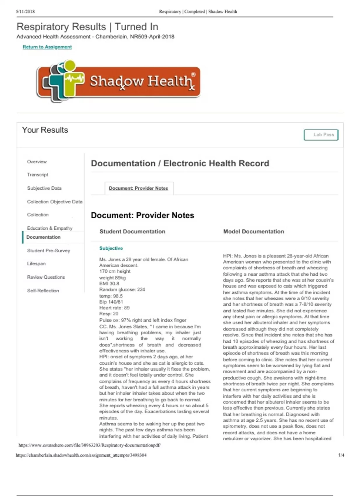 Respiratory Results | Turned In Advanced Health Assessment - Chamberlain, NR509-April-2018 Return to Assignment Your Results Lab Pass Documentation / Electronic Health Record Document: Provider Notes Document: Provider Notes Student Documentation Model Documentation Subjective Ms. Jones a 28 year old female. Of African American descent. 170 cm height weight 89kg BMI 30.8 Random glucose: 224 temp: 98.5 B/p 140/81 Heart rate: 89 Resp: 20 Pulse ox: 97% right and left index finger CC. Ms. Jones States, " I came in because I'm having breathing problems, my inhaler just isn't working the way it normally does".shortness of breath and decreased effectiveness with inhaler use. HPI: onset of symptoms 2 days ago, at her cousin's house and she as cat is allergic to cats. She states "her inhaler usually it fixes the problem, and it doesn't feel totally under control. She complains of frequency as every 4 hours shortness of breath, haven't had a full asthma attack in years but her inhaler inhaler takes about when the two minutes for her breathing to go back to normal. She reports wheezing every 4 hours or so about 5 episodes of the day. Exacerbations lasting several minutes. Asthma seems to be waking her up the past two nights. The past few days asthma has been interfering with her activities of daily living. Patient HPI: Ms. Jones is a pleasant 28-year-old African American woman who presented to the clinic with complaints of shortness of breath and wheezing following a near asthma attack that she had two days ago. She reports that she was at her cousin’s house and was exposed to cats which triggered her asthma symptoms. At the time of the incident she notes that her wheezes were a 6/10 severity and her shortness of breath was a 7-8/10 severity and lasted five minutes. She did not experience any chest pain or allergic symptoms. At that time she used her albuterol inhaler and her symptoms decreased although they did not completely resolve. Since that incident she notes that she has had 10 episodes of wheezing and has shortness of breath approximately every four hours. Her last episode of shortness of breath was this morning before coming to clinic. She notes that her current symptoms seem to be worsened by lying flat and movement and are accompanied by a non-productive cough. She awakens with night-time shortness of breath twice per night. She complains that her current symptoms are beginning to interfere with her daily activities and she is concerned that her albuterol inhaler seems to be less effective than previous. Currently she states that her breathing is normal. Diagnosed with asthma at age 2.5 years. She has no recent use of spirometry, does not use a peak flow, does not record attacks, and does not have a home nebulizer or vaporizer. She has been hospitalized five times