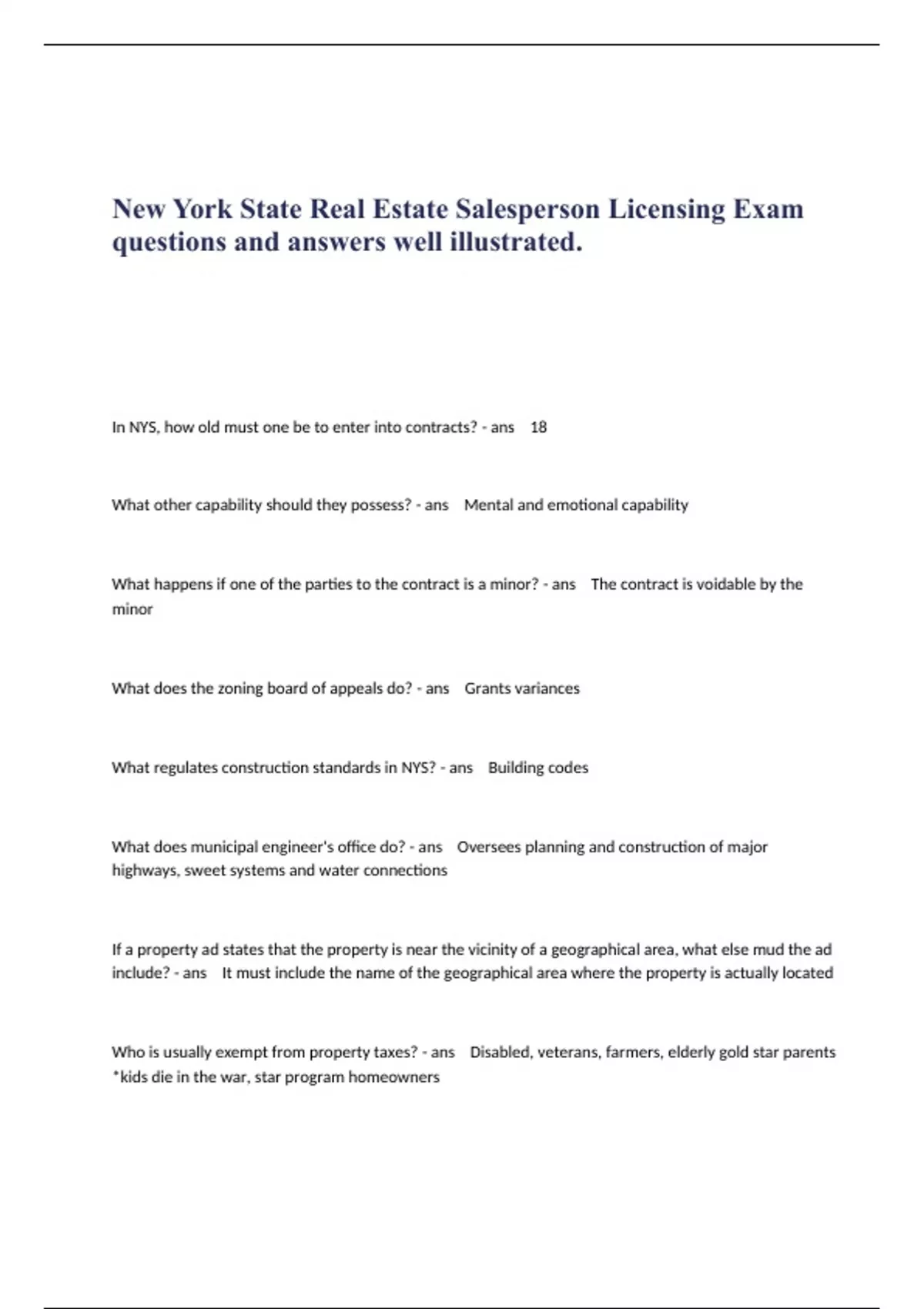 In NYS, how old must one be to enter into contracts? - ans 18 What other capability should they possess? - ans Mental and emotional capability What happens if one of the parties to the contract is a minor? - ans The contract is voidable by the minor What does the zoning board of appeals do? - ans Grants variances What regulates construction standards in NYS? - ans Building codes What does municipal engineer's office do? - ans Oversees planning and construction of major highways, sweet systems and water connections If a property ad states that the property is near the vicinity of a geographical area, what else mud the ad include? - ans It must include the name of the geographical area where the property is actually located Who is usually exempt from property taxes? - ans Disabled, veterans, farmers, elderly gold star parents *kids die in the war, star program homeowners