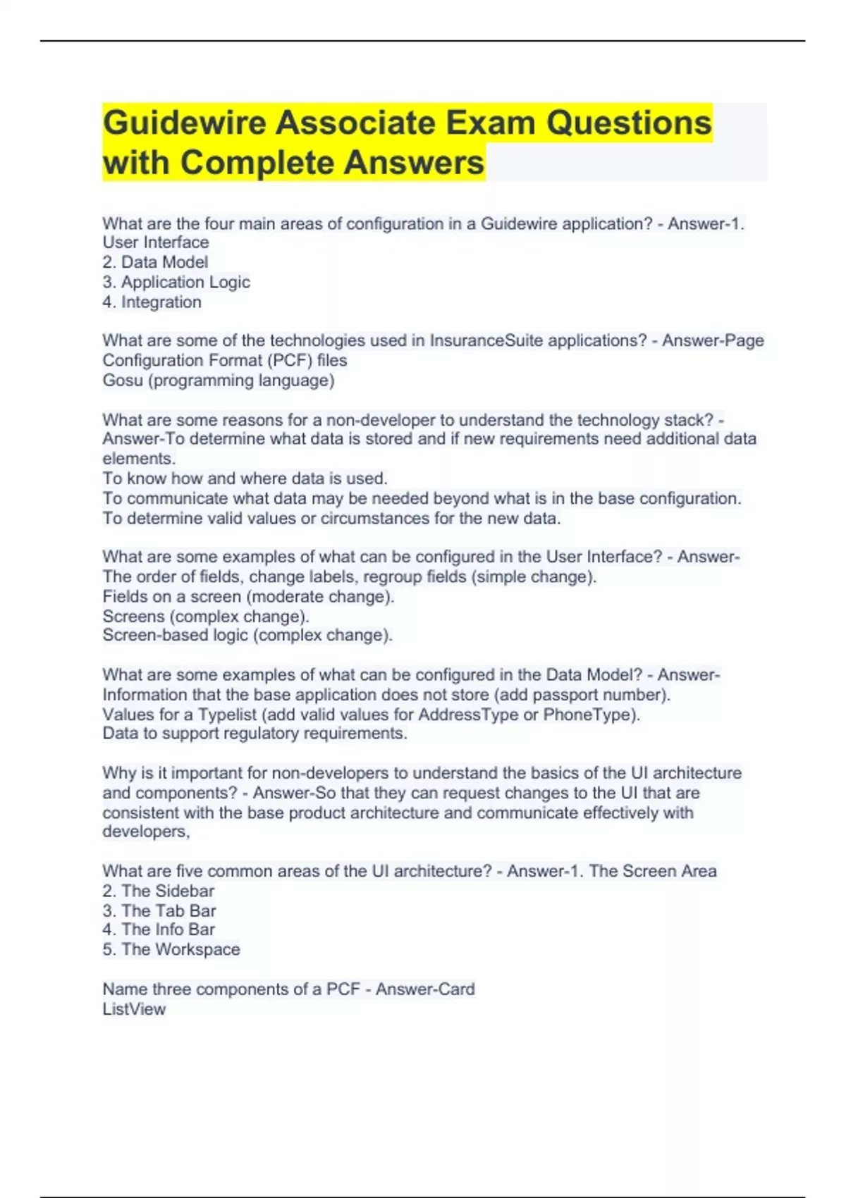 Guidewire Associate Exam Questions with Complete Answers What is the purpose of integration? - Answer-Integration allows two systems to exchange data or perform work. Why is it important for non-developers to have a basic understanding of integration? - Answer-Non-developers assist with documenting requirements including data mapping between the two systems and UI changes and communicate the requirements to developers. Name some common examples of InsuranceSuite integrations. - Answer-User authentication Geocoding Check printing Document production Document management Address verification What tasks are commonly performed by non-developers for integrations? - Answer-Non-developers often prepare data mapping documents and screen mockups needed to support integration development. Which phases in the Guidewire project lifecycle are divided into sprints? - Answer-Inception Development Stabalization