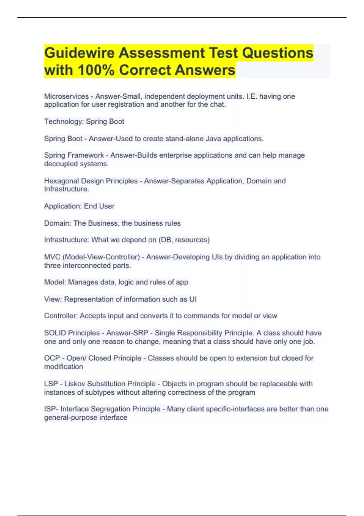 Guidewire Assessment Test Questions with 100% Correct Answers Hexagonal Design Principles - Answer-Separates Application, Domain and Infrastructure. Application: End User Domain: The Business, the business rules Infrastructure: What we depend on (DB, resources) MVC (Model-View-Controller) - Answer-Developing UIs by dividing an application into three interconnected parts. Model: Manages data, logic and rules of app