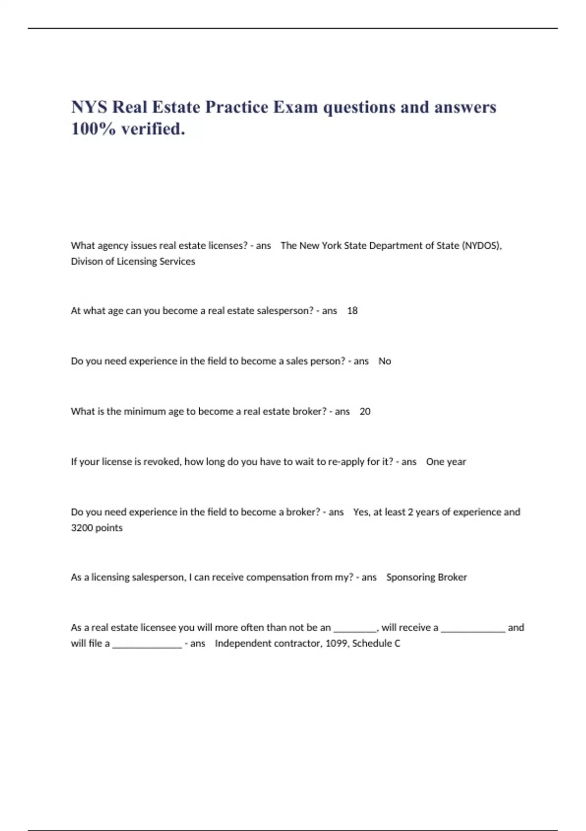 What agency issues real estate licenses? - ans The New York State Department of State (NYDOS), Divison of Licensing Services At what age can you become a real estate salesperson? - ans 18 Do you need experience in the field to become a sales person? - ans No What is the minimum age to become a real estate broker? - ans 20 If your license is revoked, how long do you have to wait to re-apply for it? - ans One year Do you need experience in the field to become a broker? - ans Yes, at least 2 years of experience and 3200 points As a licensing salesperson, I can receive compensation from my? - ans Sponsoring Broker As a real estate licensee you will more often than not be an ________, will receive a ____________ and will file a _____________ - ans Independent contractor, 1099, Schedule C