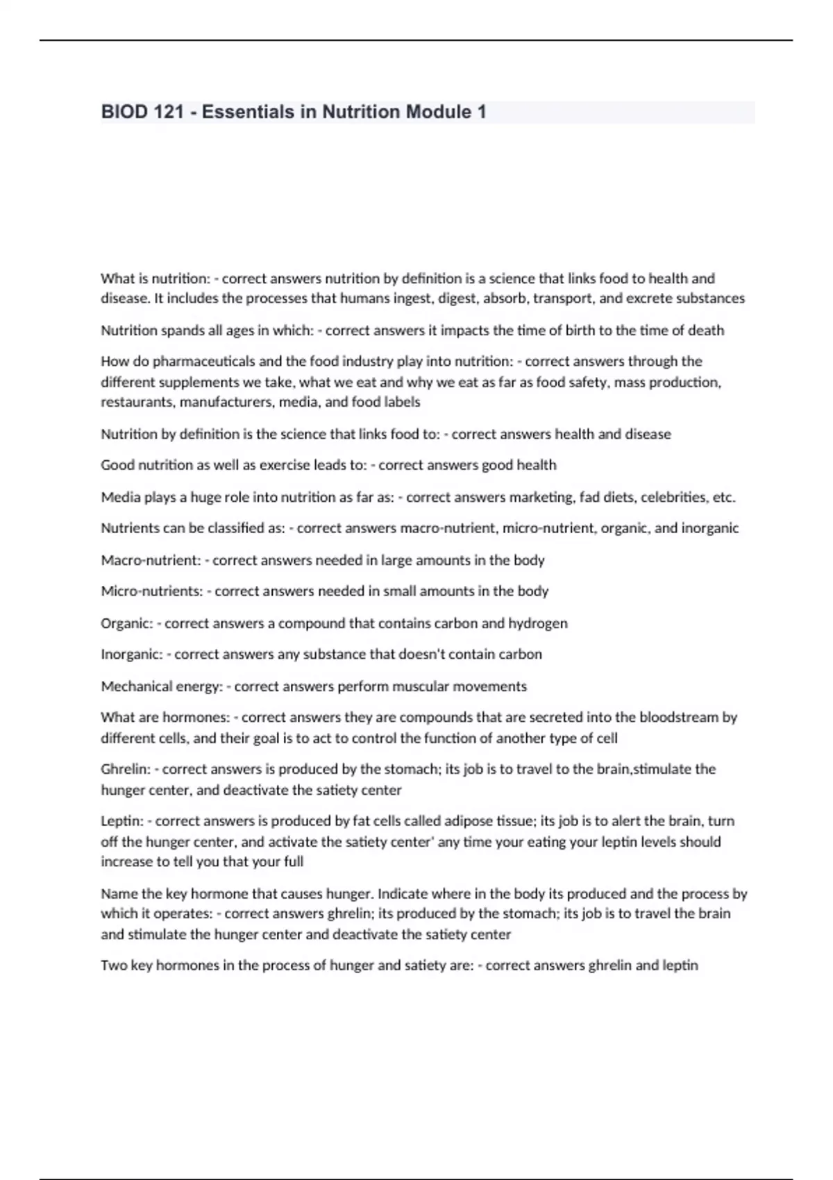 BIOD 121 - Essentials in Nutrition Module 1 What is nutrition: - correct answers nutrition by definition is a science that links food to health and disease. It includes the processes that humans ingest, digest, absorb, transport, and excrete substances Nutrition spands all ages in which: - correct answers it impacts the time of birth to the time of death How do pharmaceuticals and the food industry play into nutrition: - correct answers through the different supplements we take, what we eat and why we eat as far as food safety, mass production, restaurants, manufacturers, media, and food labels Nutrition by definition is the science that links food to: - correct answers health and disease Good nutrition as well as exercise leads to: - correct answers good health Media plays a huge role into nutrition as far as: - correct answers marketing, fad diets, celebrities, etc. Nutrients can be classified as: - correct answers macro-nutrient, micro-nutrient, organic, and inorganic Macro-nutrient: - correct answers needed in large amounts in the body Micro-nutrients: - correct answers needed in small amounts in the body Organic: - correct answers a compound that contains carbon and hydrogen Inorganic: - correct answers any substance that doesn't contain carbon Mechanical energy: - correct answers perform muscular movements What are hormones: - correct answers they are compounds that are secreted into the bloodstream by different cells, and their goal is to act to control the function of another type of cell Ghrelin: - correct answers is produced by the stomach; its job is to travel to the brain,stimulate the hunger center, and deactivate the satiety center Leptin: - correct answers is produced by fat cells called adipose tissue; its job is to alert the brain, turn off the hunger center, and activate the satiety center' any time your eating your leptin levels should increase to tell you that your full Name the key hormone that causes hunger. Indicate where in the body its produced and the process by which it operates: - correct answers ghrelin; its produced by the stomach; its job is to travel the brain and stimulate the hunger center and deactivate the satiety center Two key hormones in the process of hunger and satiety are: - correct answers ghrelin and leptin