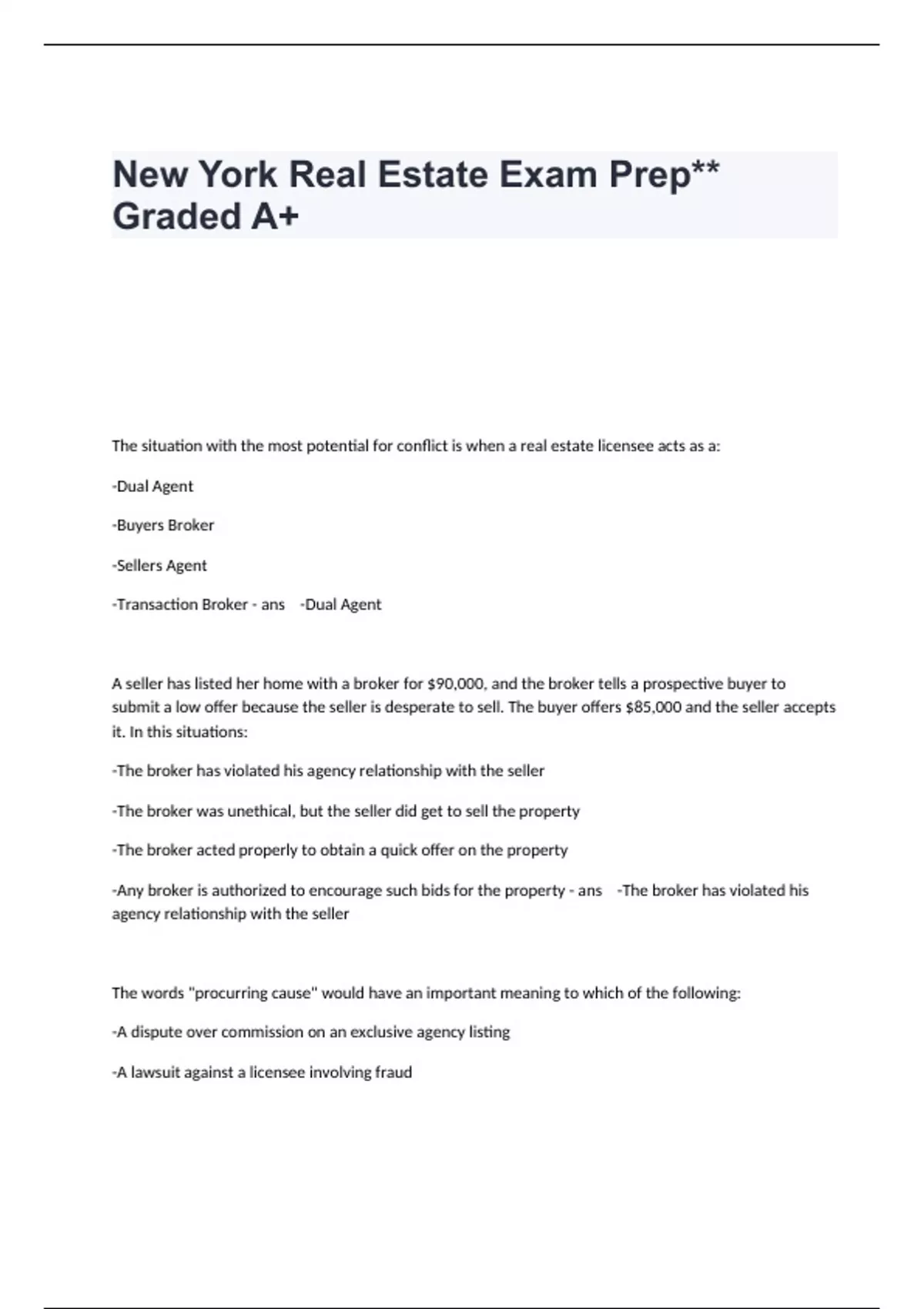 The situation with the most potential for conflict is when a real estate licensee acts as a: -Dual Agent -Buyers Broker -Sellers Agent -Transaction Broker - ans -Dual Agent A seller has listed her home with a broker for $90,000, and the broker tells a prospective buyer to submit a low offer because the seller is desperate to sell. The buyer offers $85,000 and the seller accepts it. In this situations: -The broker has violated his agency relationship with the seller -The broker was unethical, but the seller did get to sell the property -The broker acted properly to obtain a quick offer on the property -Any broker is authorized to encourage such bids for the property - ans -The broker has violated his agency relationship with the seller The words "procurring cause" would have an important meaning to which of the following: -A dispute over commission on an exclusive agency listing -A lawsuit against a licensee involving fraud