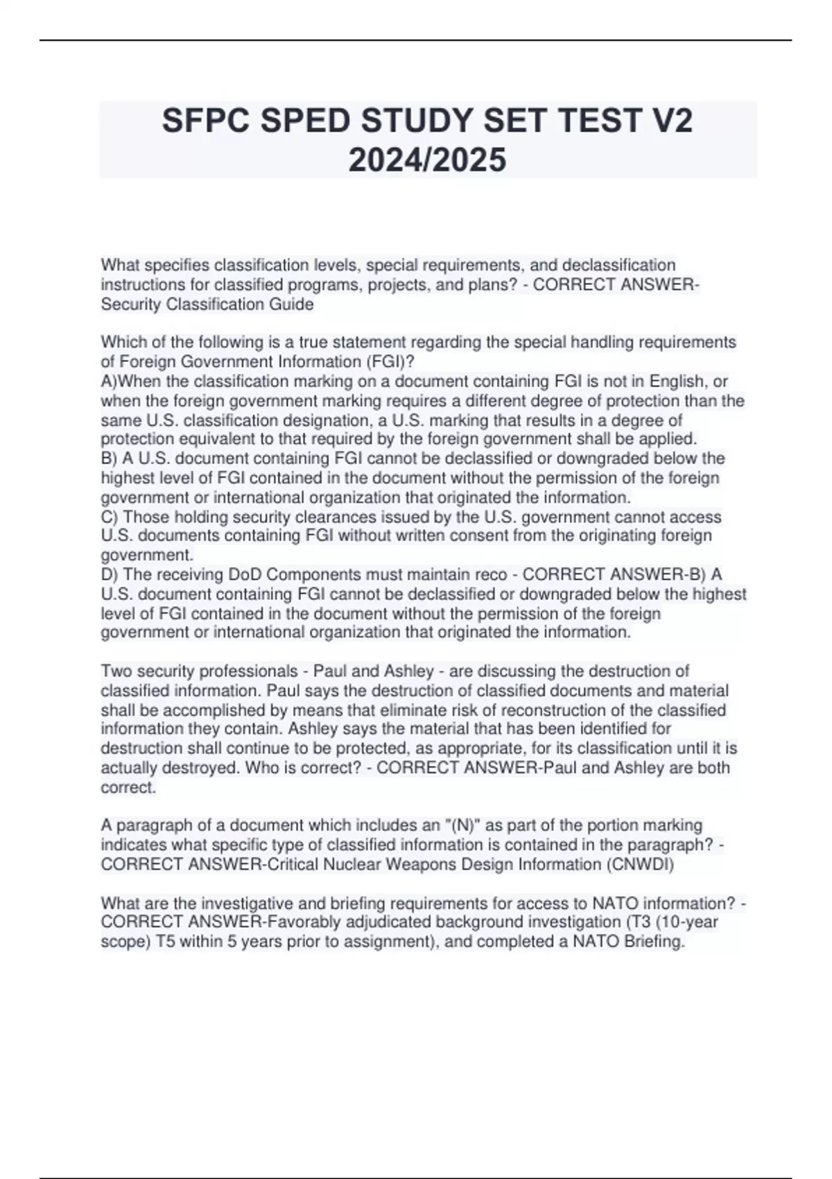 SFPC SPED STUDY SET TEST V2 2024/2025 What specifies classification levels, special requirements, and declassification instructions for classified programs, projects, and plans? - CORRECT ANSWERSecurity Classification Guide Which of the following is a true statement regarding the special handling requirements of Foreign Government Information (FGI)? A)When the classification marking on a document containing FGI is not in English, or when the foreign government marking requires a different degree of protection than the same U.S. classification designation, a U.S. marking that results in a degree of protection equivalent to that required by the foreign government shall be applied. B) A U.S. document containing FGI cannot be declassified or downgraded below the highest level of FGI contained in the document without the permission of the foreign government or international organization that originated the information. C) Those holding security clearances issued by the U.S. government cannot access U.S. documents containing FGI without written consent from the originating foreign government. D) The receiving DoD Components must maintain reco - CORRECT ANSWER-B) A U.S. document containing FGI cannot be declassified or downgraded below the highest level of FGI contained in the document without the permission of the foreign government or international organization that originated the information. Two security professionals - Paul and Ashley - are discussing the destruction of classified information. Paul says the destruction of classified documents and material shall be accomplished by means that eliminate risk of reconstruction of the classified information they contain. Ashley says the material that has been identified for destruction shall continue to be protected, as appropriate, for its classification until it is actually destroyed. Who is correct? - CORRECT ANSWER-Paul and Ashley are both correct. A paragraph of a document which includes an "(N)" as part of the portion marking indicates what specific type of classified information is contained in the paragraph? - CORRECT ANSWER-Critical Nuclear Weapons Design Information (CNWDI) What are the investigative and briefing requirements for access to NATO information? - CORRECT ANSWER-Favorably adjudicated background investigation (T3 (10-year scope) T5 within 5 years prior to assignment), and completed a NATO Briefing. According to E.O. 13556, which is considered a type of controlled unclassified information? -Communications Security (COMSEC) Information -Declassified Information -Law Enforcement Sensitive (LES) Information -North Atlantic Treaty Organization (NATO) Information - CORRECT ANSWER-Law Enforcement Sensitive Information What is the purpose of marking classified materials? - CORRECT ANSWER-To alert holders to the presence of classified information, how to properly protect it, and for how long. What is included in the markings of classified information? - CORRECT ANSWERDocument holder as the sole authority to make transfer and dissemination determinations. What is the purpose of the Controlled Access Program Coordination (CAPCO) register? - CORRECT ANSWER-To identify the official classification and control markings, and their authorized abbreviations and portion markings. When a classified data spill occurs, who is responsible for ensuring that policy requirements for addressing an unauthorized disclosure are met? - CORRECT ANSWER-Activity Security Manager There are five information assurance attributes that are important to protect and defend DoD networks and information. If there was a loss in non-repudiation, what would this cause in relation to information assurance? - CORRECT ANSWER-Data may potentially be available to unauthorized users via electronic form. What are the 5 information assurance attributes that are important to protect and defend DoD networks and information? - CORRECT ANSWER-Confidentiality Integrity Availability Authenticity Non-repudiation At the end of the day, Karen was leaving and taking with her unclassified documents she would review at home. When she began to review those documents that night, she realized that classified materials had slipped in between the unclassified materials. Is this a security violation or infraction? - CORRECT ANSWER-Security Violation The ability to deny you are the sender of an email would be an indication of a lapse in what? - CORRECT ANSWER-Integrity Unauthorized disclosure and loss of privacy is a lapse in what? - CORRECT ANSWERConfidentiality What is the first action done to downgrade, declassify or remove classificatio
