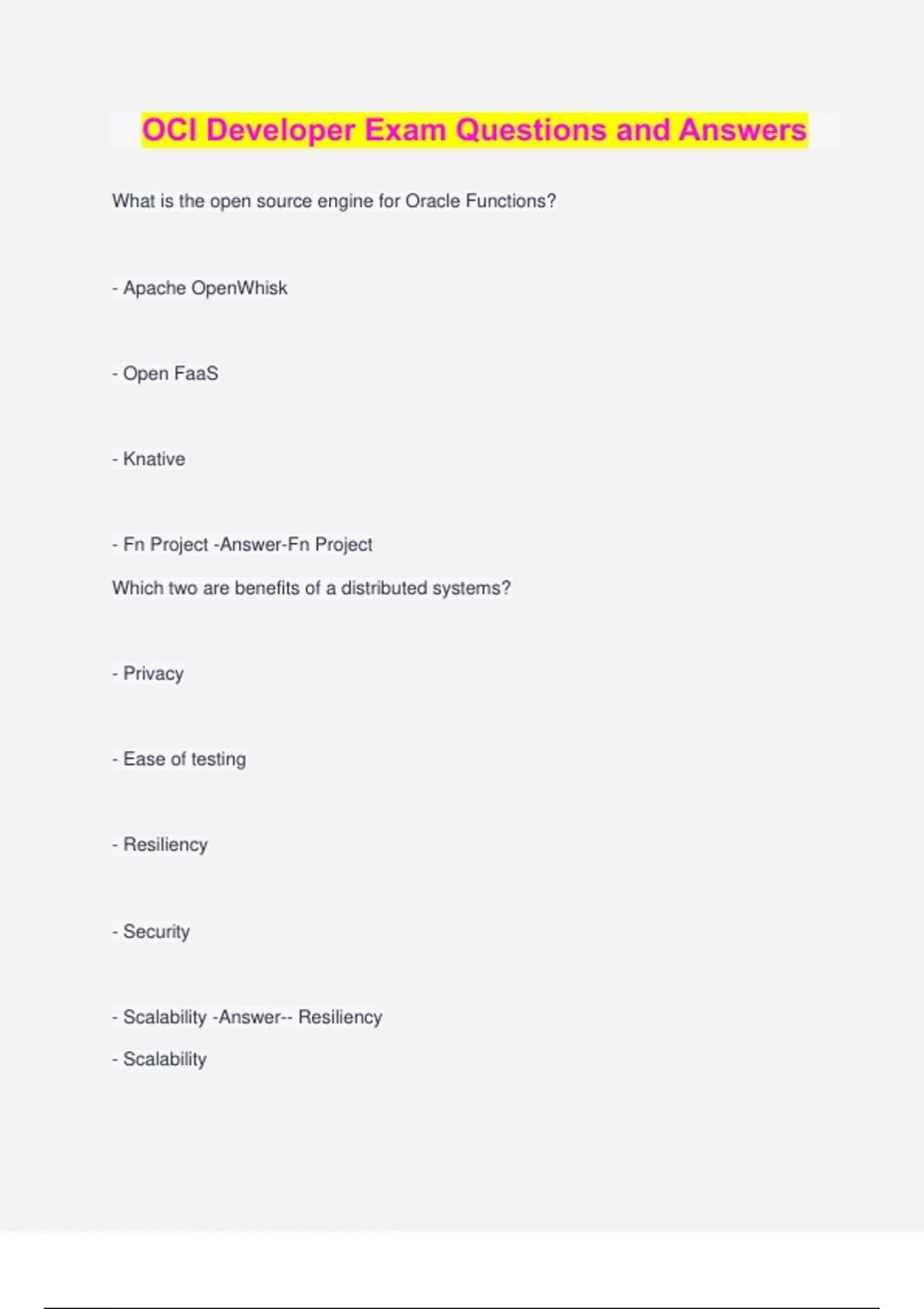 OCI Developer Exam Questions and Answers What is the open source engine for Oracle Functions? - Apache OpenWhisk - Open FaaS - Knative - Fn Project -Answer-Fn Project Which two are benefits of a distributed systems? - Privacy - Ease of testing - Resiliency - Security - Scalability -Answer-- Resiliency - Scalability You are implementing logging in your services that will be running in OCI Container Engine for Kubernetes. Which statement describes the appropriate logging approach? - Each service logs its own log file - All services log to a shared log file - All services log to an external logging system - All services log to standard output only -Answer-All services log to standard output only Which pattern can help you minimize the probability of cascading failures in your system during partial loss of connectivity or complete service failure? - Compensating transaction pattern - Anti-corruption layer pattern - Retry pattern - Circuit breaker pattern -Answer-Circuit breaker pattern Which two statements are true for service choreography? - Service choreography should not use events for communication - Service choreography is responsible for invoking other services - Service involved in choreography communicate through messages/messaging systems - Service choreography relies on a central coordinator - Decision logic in service choreography is distributed -Answer-- Service involved in choreography communicate through messages/messaging systems - Decision logic in service choreography is distributed Which two statements accurately describe Oracle SQL Developer Web OCI Autonomous Database? - After provisioning into an OCI compute instance, it can automatically connect to the OCI ADB instances - It is available for databases with both dedicated and shared Exadata infrastructure - It is available for databases with dedicated Exadata infrastructure only - It provides a development environment and a data modeler interface for OCI ADBs - It must be enabled via OCI Identity and Access Management policy to get access to the ADB instances -Answer-- It is available for databases with both dedicated and shared Exadata infrastructure - It provides a development environment and a data modeler interface for OCI ADBs Your organization uses federated identity provider to login to your OCI environment. As a developer, you are writing a script to automate some operations and want use OCI CLI to do that. Your security team doesn't allow storing private keys on local machines. How can you authenticate with OCI CLI? - Run oci session refresh - profile <profile_name> - Run oci setup keys and provide your credentials - Run oci setup oci-cli-rc-file path/to/target/file - Run oci session authenticate and provide your credentials -Answer-Run oci session authenticate and provide your credentials As a cloud-native developer, you have written a web service for your company. You have used OCI API Gateway service to expose the HTTP backend. However, your security team has suggested that your web service should handle Distributed Denial of Service (DDoS) attack. You are time-constrained and you need to make sure that this implemented as soon as possible. What should you do in this scenario? - Use a third party service integration to implement a DDoS attack mitigation - Use OCI VCN segregation to control DDoS - Use OCI API Gateway service to configure rate limiting - Re-write your web service and implement rate limiting -Answer-Use OCI API Gateway service to configure rate limiting You encounter an unexpected error when invoking the Oracle Function named "myfunction" in application "myapp". Which can you use to get more information on the error? - fn --debug invoke myapp myfunction