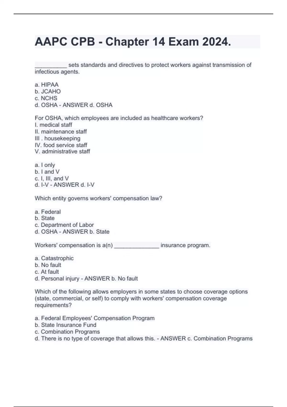 AAPC CPB - Chapter 14 Exam 2024.__________ sets standards and directives to protect workers against transmission of infectious agents. a. HIPAA b. JCAHO c. NCHS d. OSHA - ANSWER d. OSHA For OSHA, which employees are included as healthcare workers? I. medical staff II. maintenance staff III . housekeeping IV. food service staff V. administrative staff a. I only b. I and V c. I, III, and V d. I-V - ANSWER d. I-V Which entity governs workers' compensation law? a. Federal b. State c. Department of Labor d. OSHA - ANSWER b. State Workers' compensation is a(n) ______________ insurance program. a. Catastrophic b. No fault c. At fault d. Personal injury - ANSWER b. No fault Which of the following allows employers in some states to choose coverage options (state, commercial, or self) to comply with workers' compensation coverage requirements? a. Federal Employees' Compensation Program b. State Insurance Fund c. Combination Programs d. There is no type of coverage that allows this. - ANSWER c. Combination Programs
