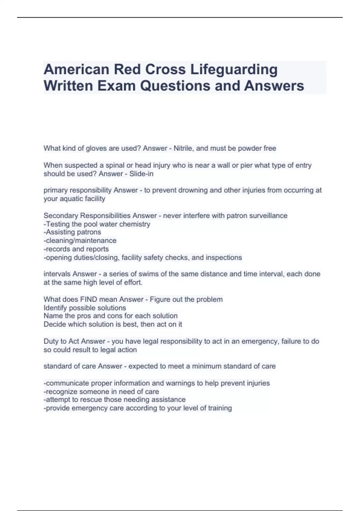 American Red Cross Lifeguarding Written Exam Questions and Answers