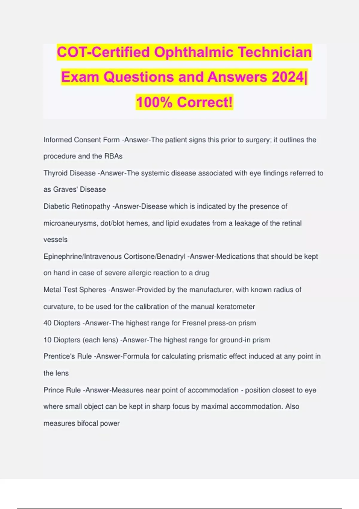 COT-Certified Ophthalmic Technician Exam Questions and Answers 2024| 100% Correct! Informed Consent Form -Answer-The patient signs this prior to surgery; it outlines the procedure and the RBAs Thyroid Disease -Answer-The systemic disease associated with eye findings referred to as Graves' Disease Diabetic Retinopathy -Answer-Disease which is indicated by the presence of microaneurysms, dot/blot hemes, and lipid exudates from a leakage of the retinal vessels Epinephrine/Intravenous Cortisone/Benadryl -Answer-Medications that should be kept on hand in case of severe allergic reaction to a drug Metal Test Spheres -Answer-Provided by the manufacturer, with known radius of curvature, to be used for the calibration of the manual keratometer 40 Diopters -Answer-The highest range for Fresnel press-on prism 10 Diopters (each lens) -Answer-The highest range for ground-in prism Prentice's Rule -Answer-Formula for calculating prismatic effect induced at any point in the lens Prince Rule -Answer-Measures near point of accommodation - position closest to eye where small object can be kept in sharp focus by maximal accommodation. Also measures bifocal power Snell's Law -Answer-Determines the index of refraction: speed of light in air/speed of light through the substance Prism Displacement Formula -Answer-P=C/D Refractive Index of Crown Glass -Answer-1.523 Compound Myopic Astigmatism (CMA) -Answer-Represented by minus spherical and minus cylindrical lenses Clinical Definition of Infinity -Answer-20 feet (6 meters) and beyond Punctum Dilator/Lacrimal Needle or Probe -Answer-Instruments used for lacrimal irrigation Electrolysis -Answer-Procedure which treats trichiasis Argon/Blue-Green Light Laser -Answer-Laser which is used to coagulate blood or seal off blood vessels Endophthalmitis -Answer-Ocular emergency following cataract surgery when a patient presents with symptoms of a painful red eye and decreased vision within the first week Trabeculectomy -Answer-Glaucoma surgery that permits aqueous to filter out of the anterior chamber and form a conjunctival bleb Enucleation -Answer-Total removal of the eye globe Evisceration -Answer-Removal of the contents of the eye, leaving the outer shell with the muscles attached Physiologic Blind Spot -Answer-15 degrees Temporal to Fixation 1,000 Apostilbs or 1430 Lumens -Answer-Light meter readings for calibrating a Goldmann perimeter Red Color Stimulus -Answer-Used on an automated perimeter test for detecting macular defects Blue Color Stimulus on Yellow Background -Answer-Used for earlier detection of visual field loss Amsler Grid Visual Field -Answer-Central 20 degrees (or 10 degrees from fixation) Tubular/Spiral Visual Field Defects -Answer-Indicated in hysterical patients Binocular Visual Field -Answer-Extends 120 degrees Bitemporal Hemianopsia (optic chiasm) -Answer-A lesion at the optic chiasm, may involve only fibers crossing over to the opposite side. Since these fibers originate in the nasal half of each retina, visual loss involves the temporal half of each field. May be caused by a tumor