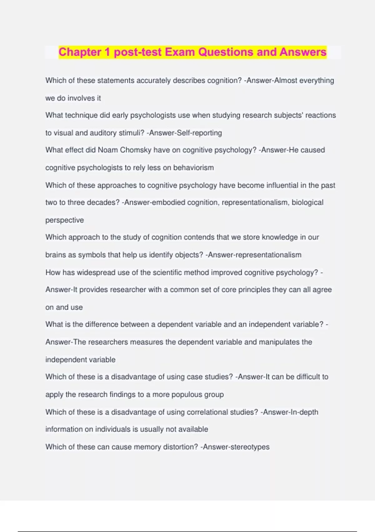 Chapter 1 post-test Exam Questions and Answers Which of these statements accurately describes cognition? -Answer-Almost everything we do involves it What technique did early psychologists use when studying research subjects' reactions to visual and auditory stimuli? -Answer-Self-reporting What effect did Noam Chomsky have on cognitive psychology? -Answer-He caused cognitive psychologists to rely less on behaviorism Which of these approaches to cognitive psychology have become influential in the past two to three decades? -Answer-embodied cognition, representationalism, biological perspective Which approach to the study of cognition contends that we store knowledge in our brains as symbols that help us identify objects? -Answer-representationalism How has widespread use of the scientific method improved cognitive psychology? - Answer-It provides researcher with a common set of core principles they can all agree on and use