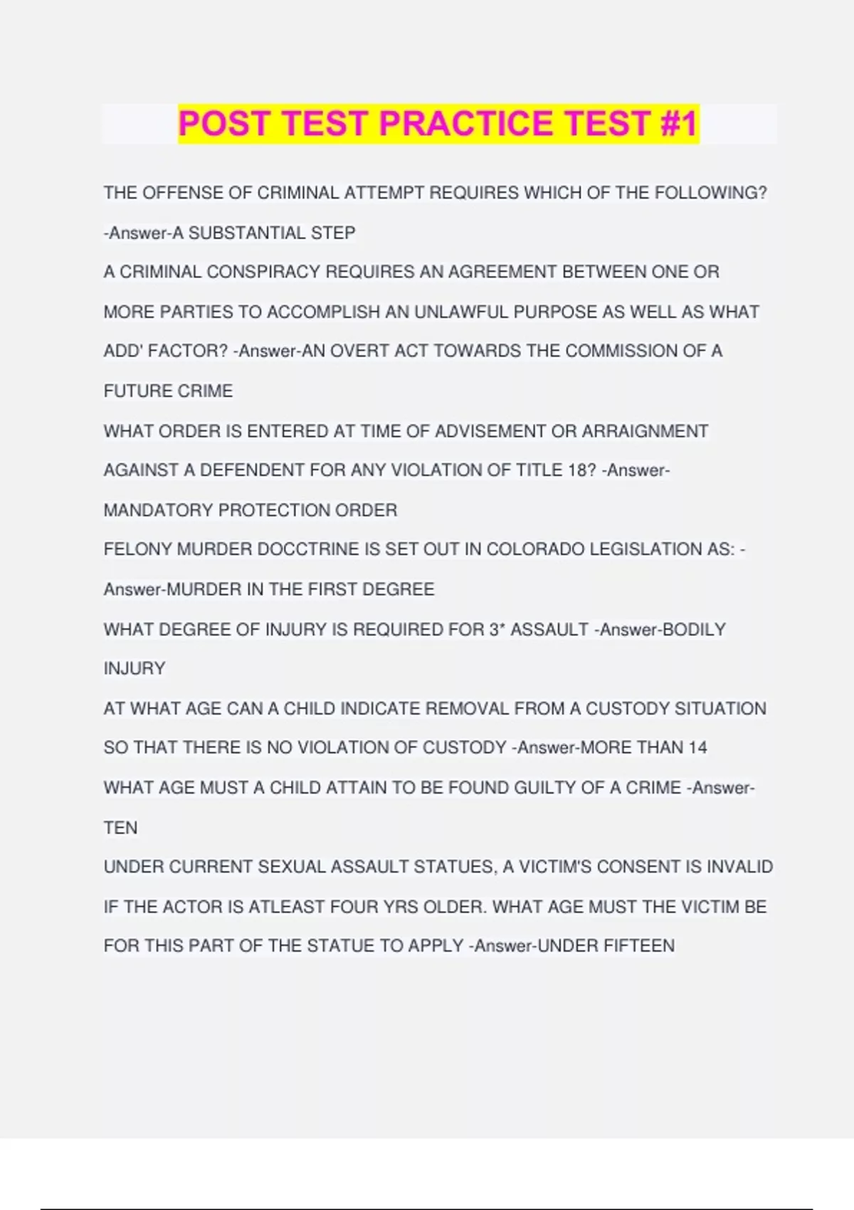 POST TEST PRACTICE TEST #1 THE OFFENSE OF CRIMINAL ATTEMPT REQUIRES WHICH OF THE FOLLOWING? -Answer-A SUBSTANTIAL STEP A CRIMINAL CONSPIRACY REQUIRES AN AGREEMENT BETWEEN ONE OR MORE PARTIES TO ACCOMPLISH AN UNLAWFUL PURPOSE AS WELL AS WHAT ADD' FACTOR? -Answer-AN OVERT ACT TOWARDS THE COMMISSION OF A FUTURE CRIME WHAT ORDER IS ENTERED AT TIME OF ADVISEMENT OR ARRAIGNMENT AGAINST A DEFENDENT FOR ANY VIOLATION OF TITLE 18? -Answer- MANDATORY PROTECTION ORDER FELONY MURDER DOCCTRINE IS SET OUT IN COLORADO LEGISLATION AS: - Answer-MURDER IN THE FIRST DEGREE WHAT DEGREE OF INJURY IS REQUIRED FOR 3* ASSAULT -Answer-BODILY INJURY AT WHAT AGE CAN A CHILD INDICATE REMOVAL FROM A CUSTODY SITUATION SO THAT THERE IS NO VIOLATION OF CUSTODY -Answer-MORE THAN 14 WHAT AGE MUST A CHILD ATTAIN TO BE FOUND GUILTY OF A CRIME -Answer- TEN UNDER CURRENT SEXUAL ASSAULT STATUES, A VICTIM'S CONSENT IS INVALID IF THE ACTOR IS ATLEAST FOUR YRS OLDER. WHAT AGE MUST THE VICTIM BE FOR THIS PART OF THE STATUE TO APPLY -Answer-UNDER FIFTEEN