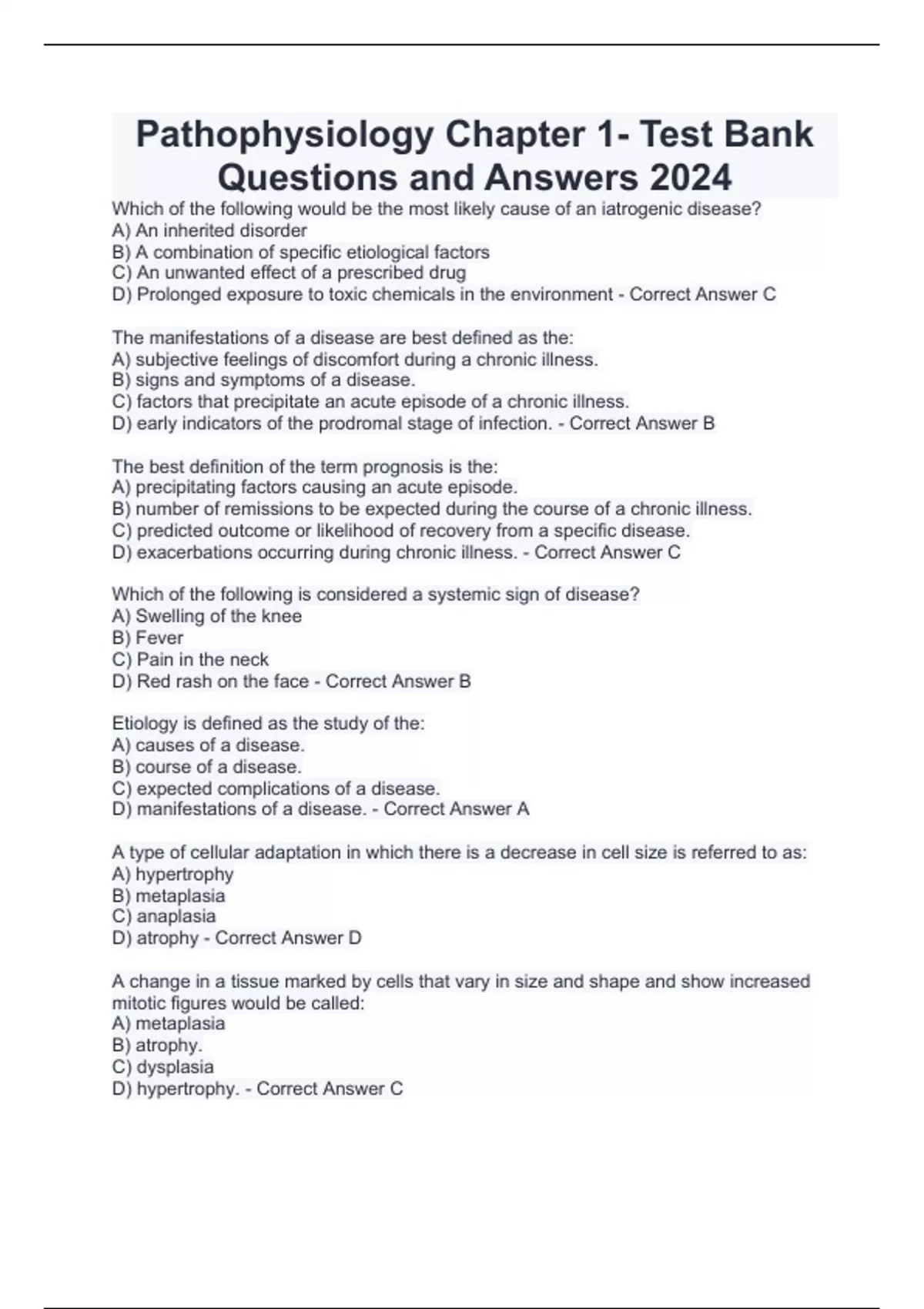 Which of the following would be the most likely cause of an iatrogenic disease? A) An inherited disorder B) A combination of specific etiological factors C) An unwanted effect of a prescribed drug D) Prolonged exposure to toxic chemicals in the environment - Correct Answer C The manifestations of a disease are best defined as the: A) subjective feelings of discomfort during a chronic illness. B) signs and symptoms of a disease. C) factors that precipitate an acute episode of a chronic illness. D) early indicators of the prodromal stage of infection. - Correct Answer B The best definition of the term prognosis is the: A) precipitating factors causing an acute episode. B) number of remissions to be expected during the course of a chronic illness. C) predicted outcome or likelihood of recovery from a specific disease. D) exacerbations occurring during chronic illness. - Correct Answer C Which of the following is considered a systemic sign of disease? A) Swelling of the knee B) Fever C) Pain in the neck D) Red rash on the face - Correct Answer B Etiology is defined as the study of the: A) causes of a disease. B) course of a disease. C) expected complications of a disease. D) manifestations of a disease. - Correct Answer A A type of cellular adaptation in which there is a decrease in cell size is referred to as: A) hypertrophy B) metaplasia C) anaplasia D) atrophy - Correct Answer D A change in a tissue marked by cells that vary in size and shape and show increased mitotic figures would be called: A) metaplasia B) atrophy. C) dysplasia D) hypertrophy. - Correct Answer C