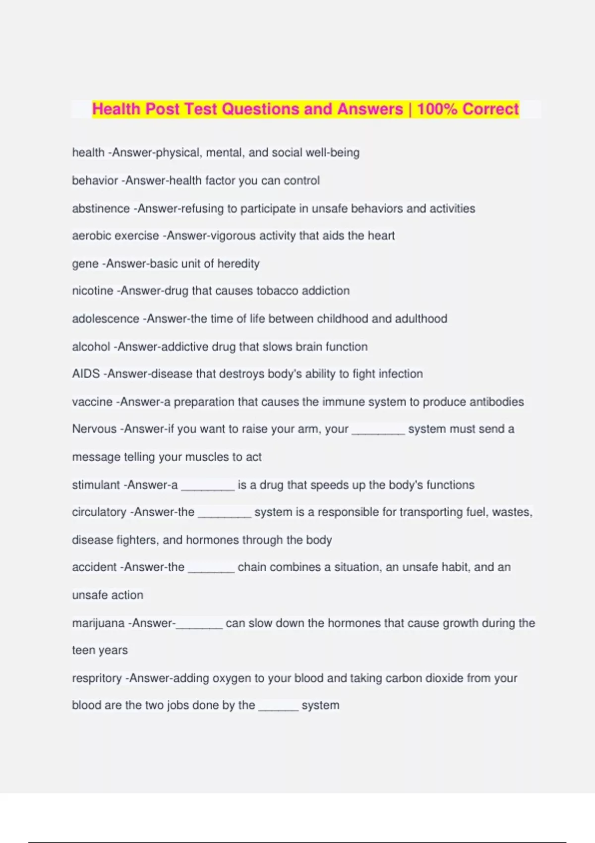 Health Post Test Questions and Answers | 100% Correct health -Answer-physical, mental, and social well-being behavior -Answer-health factor you can control abstinence -Answer-refusing to participate in unsafe behaviors and activities aerobic exercise -Answer-vigorous activity that aids the heart gene -Answer-basic unit of heredity nicotine -Answer-drug that causes tobacco addiction adolescence -Answer-the time of life between childhood and adulthood alcohol -Answer-addictive drug that slows brain function AIDS -Answer-disease that destroys body's ability to fight infection vaccine -Answer-a preparation that causes the immune system to produce antibodies Nervous -Answer-if you want to raise your arm, your ________ system must send a message telling your muscles to act stimulant -Answer-a ________ is a drug that speeds up the body's functions circulatory -Answer-the ________ system is a responsible for transporting fuel, wastes, disease fighters, and hormones through the body accident -Answer-the _______ chain combines a situation, an unsafe habit, and an unsafe action marijuana -Answer-_______ can slow down the hormones that cause growth during the teen years respritory -Answer-adding oxygen to your blood and taking carbon dioxide from your blood are the two jobs done by the ______ system