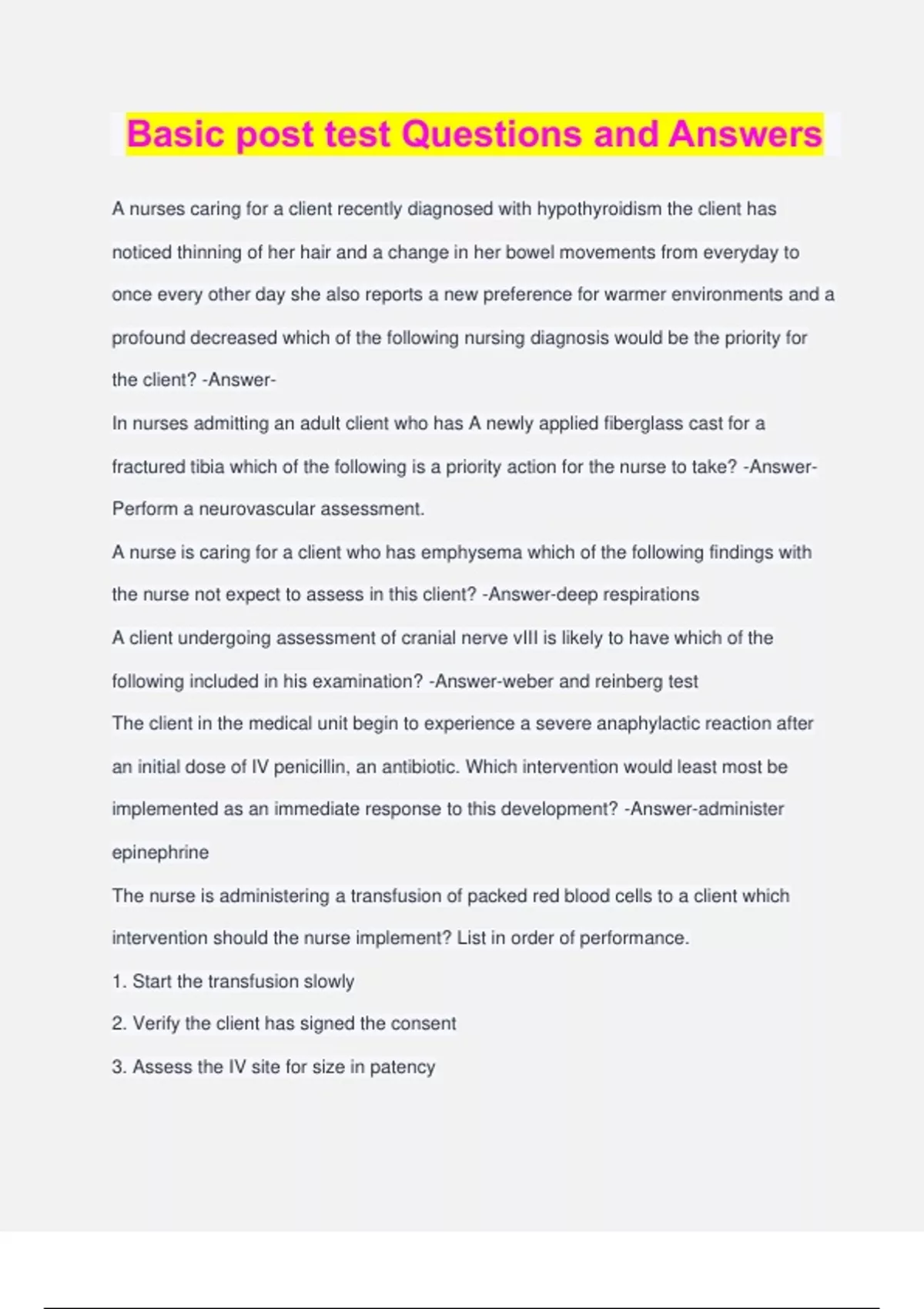 Basic post test Questions and Answers A nurses caring for a client recently diagnosed with hypothyroidism the client has noticed thinning of her hair and a change in her bowel movements from everyday to once every other day she also reports a new preference for warmer environments and a profound decreased which of the following nursing diagnosis would be the priority for the client? -Answer- In nurses admitting an adult client who has A newly applied fiberglass cast for a fractured tibia which of the following is a priority action for the nurse to take? -Answer- Perform a neurovascular assessment. A nurse is caring for a client who has emphysema which of the following findings with the nurse not expect to assess in this client? -Answer-deep respirations A client undergoing assessment of cranial nerve vIII is likely to have which of the following included in his examination? -Answer-weber and reinberg test The client in the medical unit begin to experience a severe anaphylactic reaction after an initial dose of IV penicillin, an antibiotic. Which intervention would least most be implemented as an immediate response to this development? -Answer-administer epinephrine The nurse is administering a transfusion of packed red blood cells to a client which intervention should the nurse implement? List in order of performance. 1. Start the transfusion slowly 2. Verify the client has signed the consent 3. Assess the IV site for size in patency