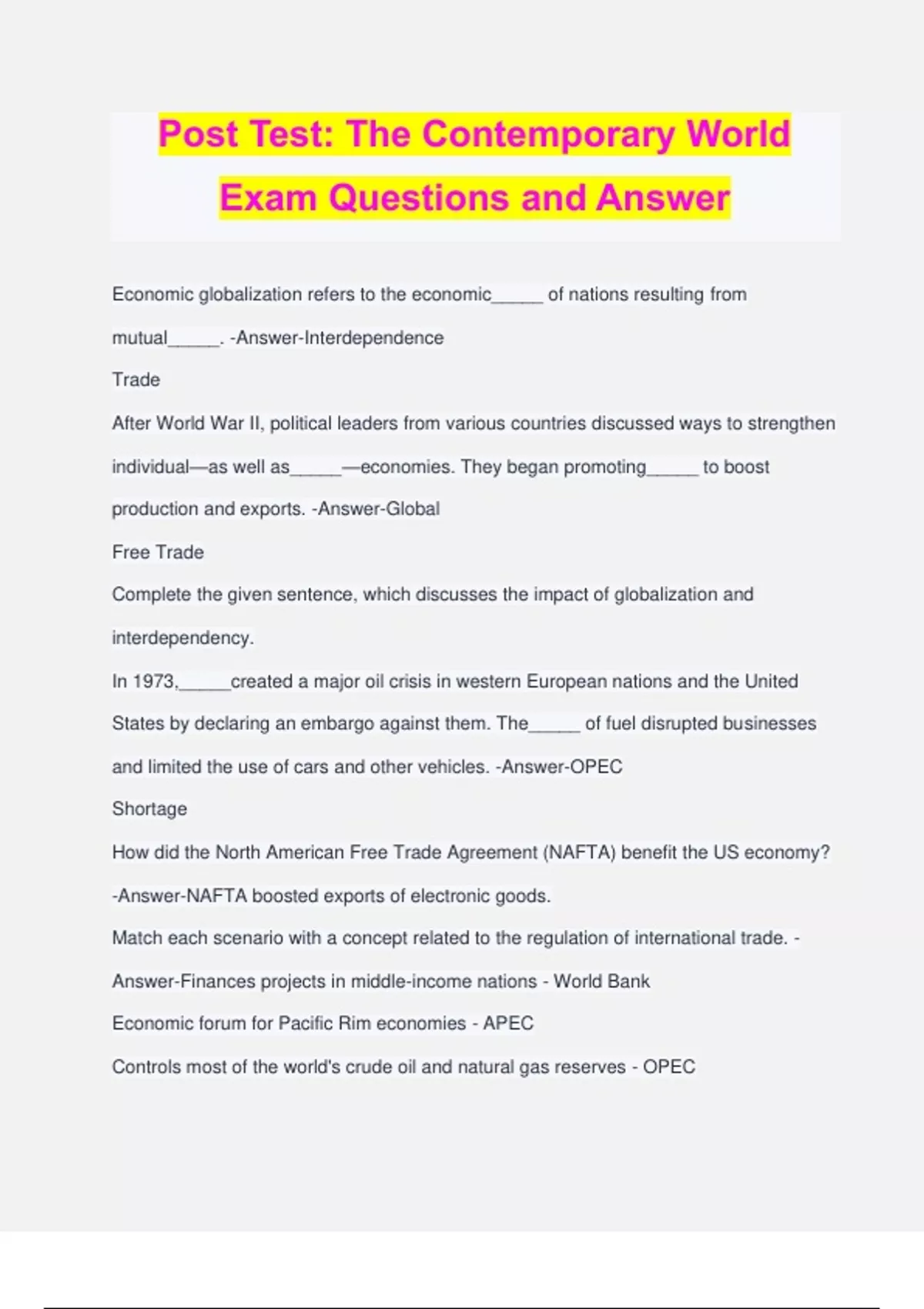 Post Test: The Contemporary World Exam Questions and Answer Economic globalization refers to the economic_____ of nations resulting from mutual_____. -Answer-Interdependence Trade After World War II, political leaders from various countries discussed ways to strengthen individual—as well as_____—economies. They began promoting_____ to boost production and exports. -Answer-Global Free Trade Complete the given sentence, which discusses the impact of globalization and interdependency. In 1973,_____created a major oil crisis in western European nations and the United States by declaring an embargo against them. The_____ of fuel disrupted businesses and limited the use of cars and other vehicles. -Answer-OPEC Shortage How did the North American Free Trade Agreement (NAFTA) benefit the US economy? -Answer-NAFTA boosted exports of electronic goods. Match each scenario with a concept related to the regulation of international trade. - Answer-Finances projects in middle-income nations - World Bank Economic forum for Pacific Rim economies - APEC Controls most of the world's crude oil and natural gas reserves - OPEC