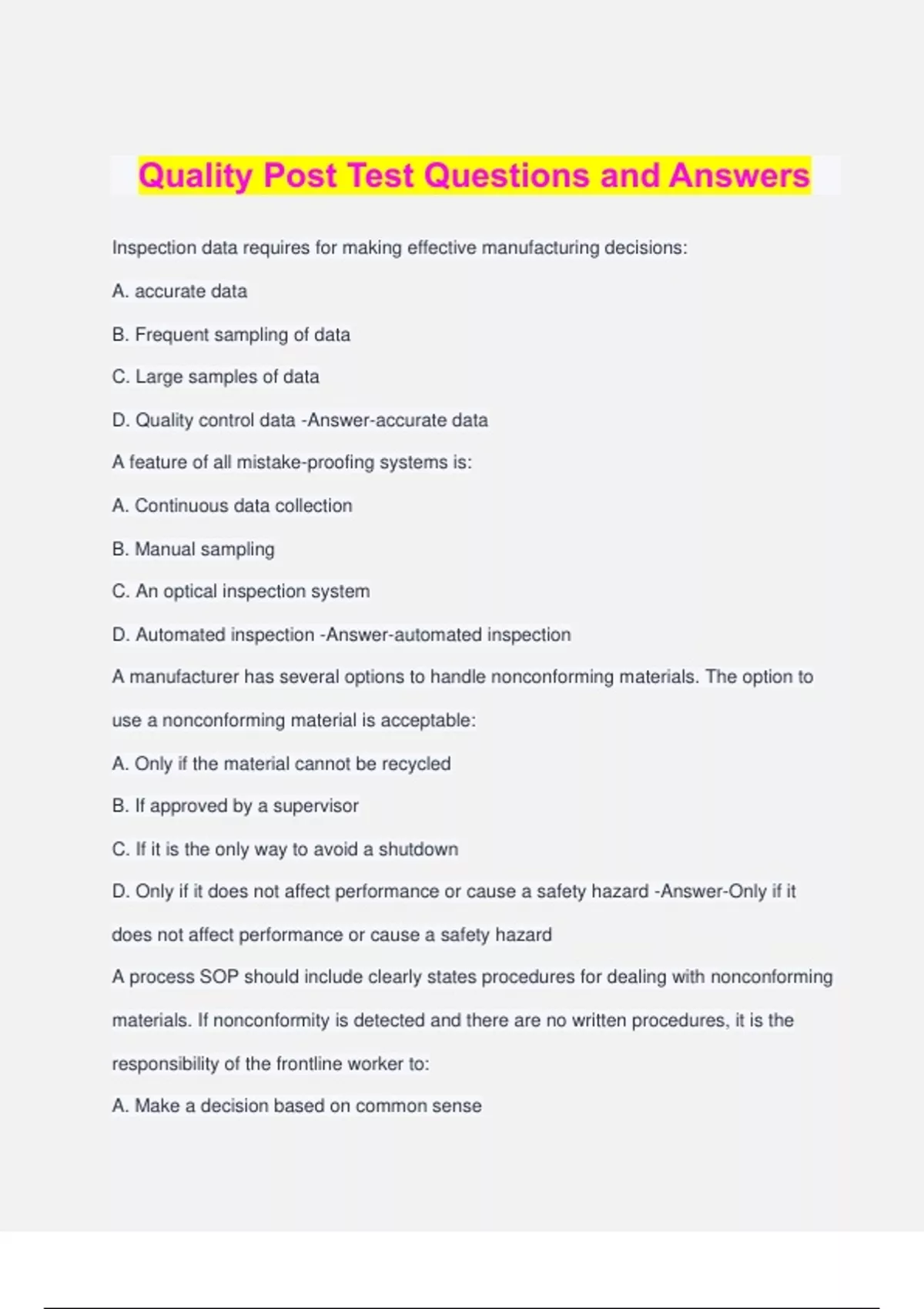 Quality Post Test Questions and Answers Inspection data requires for making effective manufacturing decisions: A. accurate data B. Frequent sampling of data C. Large samples of data D. Quality control data -Answer-accurate data A feature of all mistake-proofing systems is: A. Continuous data collection B. Manual sampling C. An optical inspection system D. Automated inspection -Answer-automated inspection A manufacturer has several options to handle nonconforming materials. The option to use a nonconforming material is acceptable: A. Only if the material cannot be recycled B. If approved by a supervisor C. If it is the only way to avoid a shutdown D. Only if it does not affect performance or cause a safety hazard -Answer-Only if it does not affect performance or cause a safety hazard A process SOP should include clearly states procedures for dealing with nonconforming materials. If nonconformity is detected and there are no written procedures, it is the responsibility of the frontline worker to: A. Make a decision based on common sense B. Stop working immediately and file a report C. Refer the problem to a supervisor or responsible department D. Continue working until instructed to do otherwise -Answer-Refer the problem to a supervisor or responsible department Third-parry audits provide evidence that a quality program meets standards. A third- party audit might be performed in order to: A. Train workers in correct procedures B. Correct an ongoing problem C. Acquire or maintain certification D. Meet customer needs -Answer-Acquire or maintain certification An auditor bases his/her audit report on data collected by: A. Directly observing the process B. Interviewing workers and supervisors C. Examining production records D. All of the above -Answer-All of the above Inspections can be carried out for several purposes, including as a part of continuous improvement. To perform inspections, workers should know how to: A. Read production documents B. Use inspection and analysis tools C. Read safety and environmental standards D. All of the above -Answer-All of the above A possible source of inaccuracy in inspection data is: A. Precise instrumentation B. A statistically valid sampling plan C. Proper calibration D. Human error -Answer-Human error Communication breakdowns can lead to inaccuracies and poor decisions. Detailed instructions for communicating results must be included in every: A. Quality inspection B. Inspection plan C. Automated system D. Product specification -Answer-Inspection plan The inspection frequency for any given process depends on a number of factors. This frequency is specified in a: A. Inspection plan. B. Quality system. C. Sampling plan. D. Inspection report. -Answer-Sampling plan