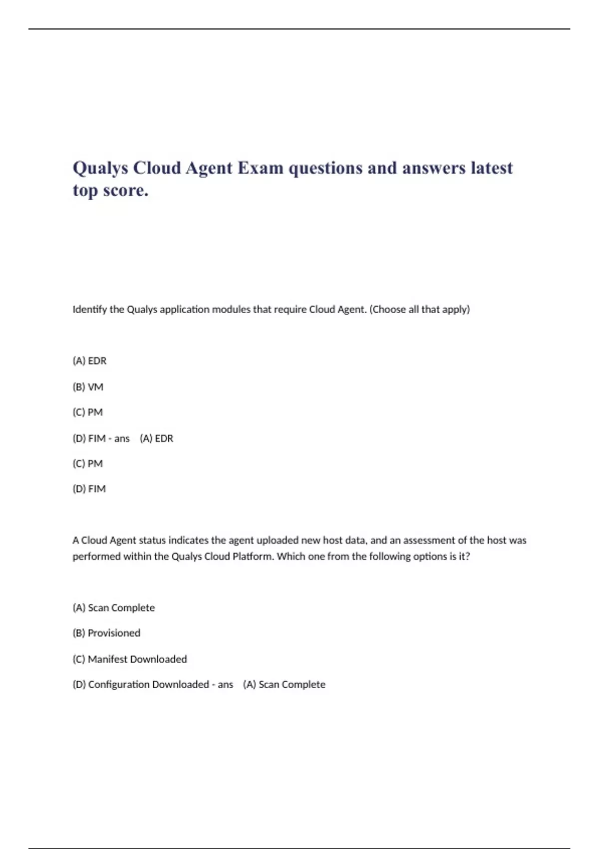 Identify the Qualys application modules that require Cloud Agent. (Choose all that apply) (A) EDR (B) VM (C) PM (D) FIM - ans (A) EDR (C) PM (D) FIM A Cloud Agent status indicates the agent uploaded new host data, and an assessment of the host was performed within the Qualys Cloud Platform. Which one from the following options is it? (A) Scan Complete (B) Provisioned (C) Manifest Downloaded (D) Configuration Downloaded - ans (A) Scan Complete