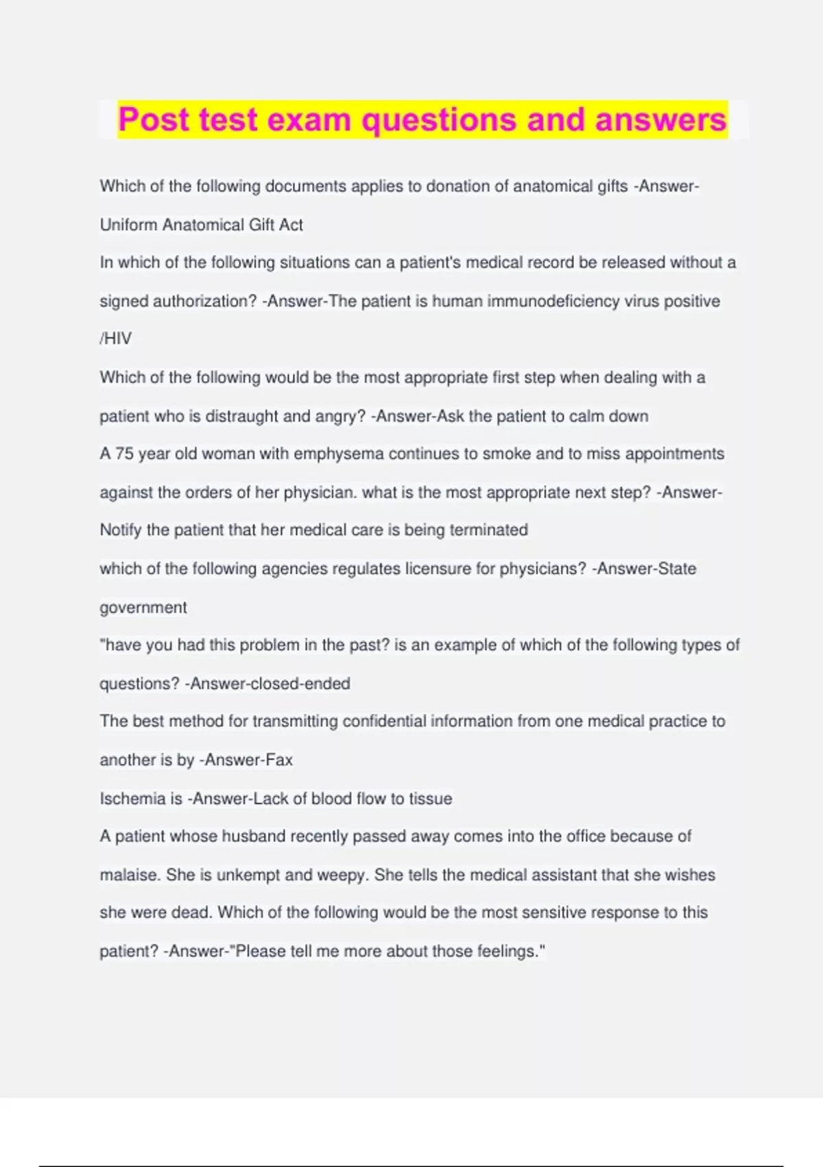 Post test exam questions and answers Which of the following documents applies to donation of anatomical gifts -Answer- Uniform Anatomical Gift Act In which of the following situations can a patient's medical record be released without a signed authorization? -Answer-The patient is human immunodeficiency virus positive /HIV Which of the following would be the most appropriate first step when dealing with a patient who is distraught and angry? -Answer-Ask the patient to calm down A 75 year old woman with emphysema continues to smoke and to miss appointments against the orders of her physician. what is the most appropriate next step? -Answer- Notify the patient that her medical care is being terminated which of the following agencies regulates licensure for physicians? -Answer-State government "have you had this problem in the past? is an example of which of the following types of questions? -Answer-closed-ended The best method for transmitting confidential information from one medical practice to another is by -Answer-Fax Ischemia is -Answer-Lack of blood flow to tissue A patient whose husband recently passed away comes into the office because of malaise. She is unkempt and weepy. She tells the medical assistant that she wishes she were dead. Which of the following would be the most sensitive response to this patient? -Answer-"Please tell me more about those feelings." Tingling in the hands, numbness in the arm, and frequent episodes of blurred vision are characteristic of -Answer-Transient ischemic attack Which of the following punctuation marks is used to indicate the exact words of the patient? -Answer-Quotation marks A mucous membrane -Answer-Lines body cavities that open to the outside of the body. Which of the following is the most effective way of communicating with a patient who does not speak English? -Answer-Encouraging nonverbal communication Spermatozoa are produced in the -Answer-Seminiferous tubules The bone located in the posterior of the skullis the -Answer-Occipital According to Maslow's hierarchy of needs, which of the following is the primary motivation for human behavior? -Answer-Self-actualization A failure of bone marrow to produce red blood cells results in which type of anemia? - Answer-Hemolytic Which of the following is an example of an open-ended question? -Answer-"Can you tell me more about that? Res ipsa loquitur is best illustrated by which of the following? -Answer-A physician accidentally amputates the wrong finger from a patient Release of a patient's medical records without proper authorization might result in charges of -Answer-Invasion of privacy The alpha cells in the the pancreas are responsible for the production -Answer- Glucagon These tiny projections on the surface of the small intestines increase the surface area and allow for greater absorption of nutrients. -Answer-Villi Legally, a physician -Answer-May refuse to accept a patient if he or she chooses. Professionalism may best be displayed by -Answer-Staying calm when dealing with angry patients The combining form for uterus is -Answer-Hyster/o Personality differences are due to -Answer-Age , Experience, Heredity, Environment Which of the following is a segment of the large intestine? -Answer-Cecum Blood that is low in oxygen exits the heart through the -Answer-Pulmonary artery Which of the following telephone calls should be given immediately to the physician? - Answer-Another physician If a patient refuses to consent to treatment, the medical assistant should -Answer-Delay treatment and inform or consult with the physician Which of the following is most likely to reduce patient satisfaction with a medical practice? -Answer-Overbooking which of the following devices has the ability to digitize and convert images into an electronic format? -Answer-A scanner What is the monthly net income for a medical practice whose expenses are $8500, revenue is $14,130, total assets are $263,000, and liabilities are $53,000? -Answer- $5630 The file folder label for Jennie Holmes-Mathis should be -Answer-Holmes-Mathis, Jennie The date must be changed daily on which of the following? -Answer-Postage meter When the word Confidential is to be typed on the envelope , it should be placed - Answer-Below the return address Which of the following may be used to replace a medical record that has temporarily been removed from the filing cabinet ? -Answer-An Outguide When is the most appropriate time to discuss payment arrangements with a new patient -Answer-When the patient calls to make an appointment A tickler file is -Answer-Future events arranged in chroncol A patient has had a left thyroid lobectomy performed. In preparing the insurance claim forms, coding for which of the following body systems should be selected? -Answer- Endocrine The amount of federal tax withheld is based on the employee's exemptions, pay period, and -Answer-employee's martial status Which of the following is an example of an indirect filing system? -Answer-Numerical When creating an office policy manual, it should begin with -Answer-The mission statement Which of the following telephone calls requires immediate transfer to the physician? - Answer-Another physician