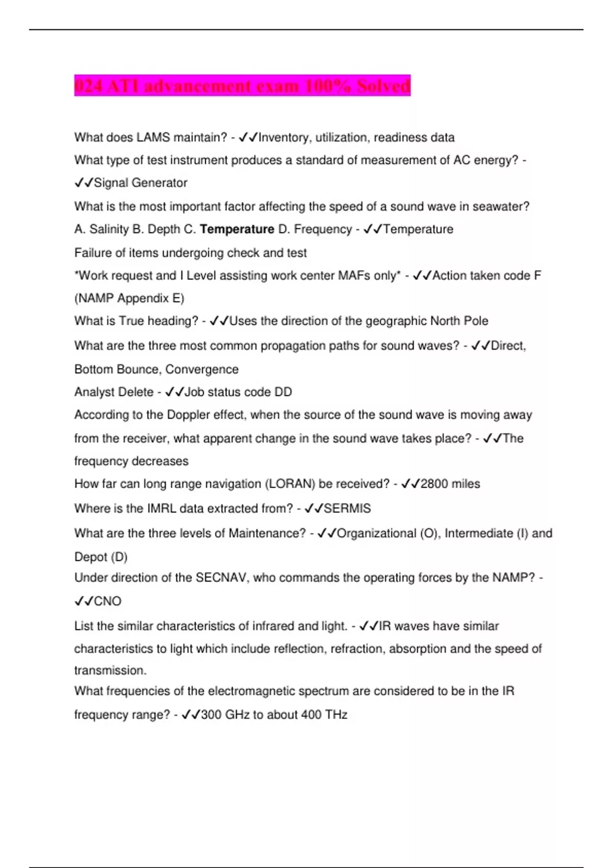 What does LAMS maintain? - Inventory, utilization, readiness data What type of test instrument produces a standard of measurement of AC energy? - Signal Generator What is the most important factor affecting the speed of a sound wave in seawater? A. Salinity B. Depth C. Temperature D. Frequency - Temperature Failure of items undergoing check and test *Work request and I Level assisting work center MAFs only* - Action taken code F (NAMP Appendix E) What is True heading? - Uses the direction of the geographic North Pole What are the three most common propagation paths for sound waves? - Direct, Bottom Bounce, Convergence Analyst Delete - Job status code DD According to the Doppler effect, when the source of the sound wave is moving away from the receiver, what apparent change in the sound wave takes place? - The frequency decreases How far can long range navigation (LORAN) be received? - 2800 miles Where is the IMRL data extracted from? - SERMIS What are the three levels of Maintenance? - Organizational (O), Intermediate (I) and Depot (D) Under direction of the SECNAV, who commands the operating forces by the NAMP? - CNO List the similar characteristics of infrared and light. - IR waves have similar characteristics to light which include reflection, refraction, absorption and the speed of transmission. What frequencies of the electromagnetic spectrum are considered to be in the IR frequency range? - 300 GHz to about 400 THz What is the electrical charge of an atom which contains 8 protons and 11 electrons - Negative charge Work stoppage-awaiting parts *when awaiting parts that are not available locally. - Action taken code L (NAMP Appendix E) Work stoppage, post and predeployment, and inter-IMA support. * entered to closeout MAF copy when component repair is to be performed at another facility. *D action* - (AT) Action taken code D (Appendix E) IFF Modes - 1- Identification 2- Squadron 3A- ATC 4- Military C- Altitude