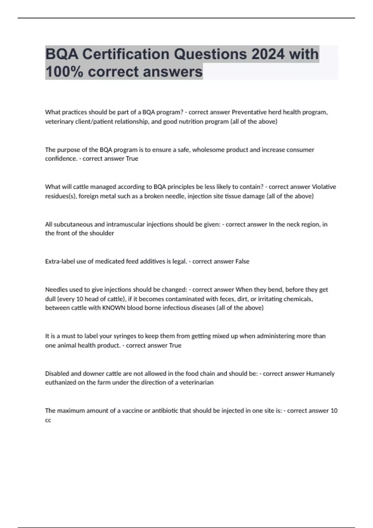 What practices should be part of a BQA program? - correct answer Preventative herd health program, veterinary client/patient relationship, and good nutrition program (all of the above) The purpose of the BQA program is to ensure a safe, wholesome product and increase consumer confidence. - correct answer True What will cattle managed according to BQA principles be less likely to contain? - correct answer Violative residues(s), foreign metal such as a broken needle, injection site tissue damage (all of the above) All subcutaneous and intramuscular injections should be given: - correct answer In the neck region, in the front of the shoulder Extra-label use of medicated feed additives is legal. - correct answer False Needles used to give injections should be changed: - correct answer When they bend, before they get dull (every 10 head of cattle), if it becomes contaminated with feces, dirt, or irritating chemicals, between cattle with KNOWN blood borne infectious diseases (all of the above) It is a must to label your syringes to keep them from getting mixed up when administering more than one animal health product. - correct answer True