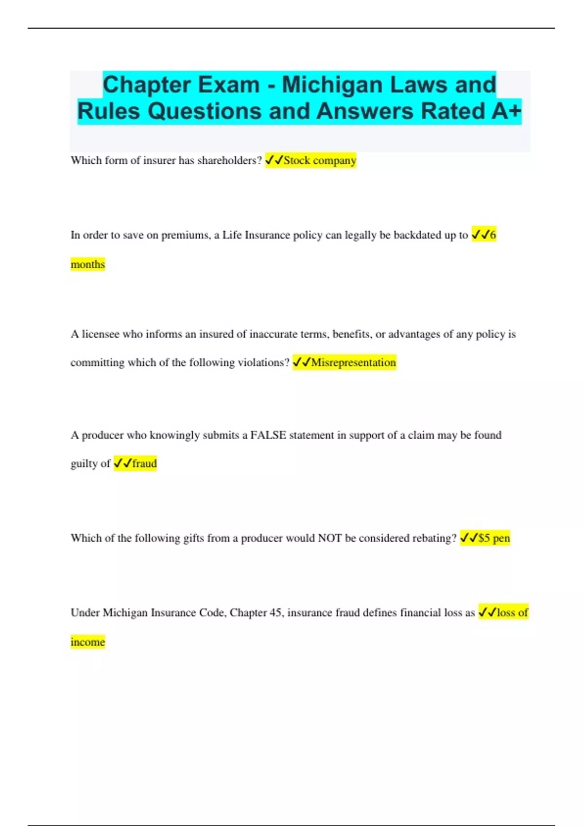 Chapter Exam - Michigan Laws and Rules Questions and Answers Rated A+