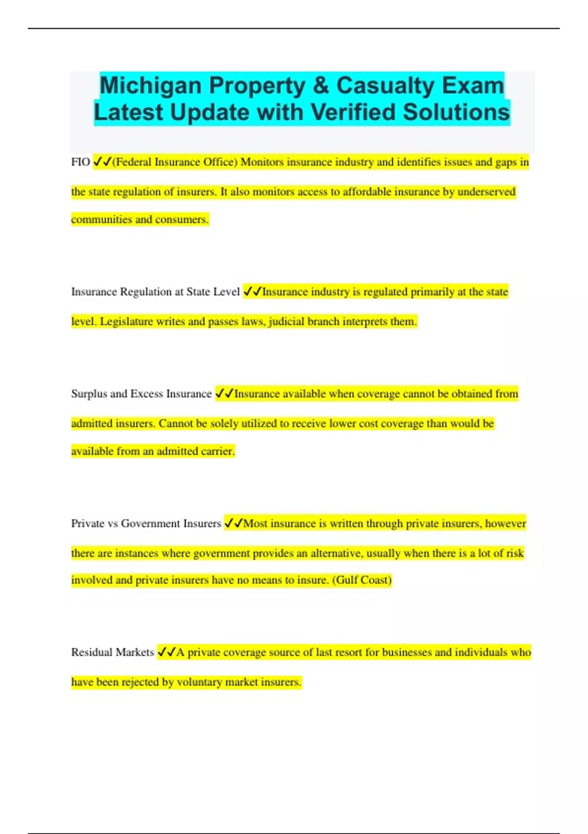 Michigan Property & Casualty Exam Latest Update with Verified Solutions FIO (Federal Insurance Office) Monitors insurance industry and identifies issues and gaps in the state regulation of insurers. It also monitors access to affordable insurance by underserved communities and consumers. Insurance Regulation at State Level Insurance industry is regulated primarily at the state level. Legislature writes and passes laws, judicial branch interprets them. Surplus and Excess Insurance Insurance available when coverage cannot be obtained from admitted insurers. Cannot be solely utilized to receive lower cost coverage than would be available from an admitted carrier. Private vs Government Insurers Most insurance is written through private insurers, however there are instances where government provides an alternative, usually when there is a lot of risk involved and private insurers have no means to insure. (Gulf Coast) Residual Markets A private coverage source of last resort for businesses and individuals who have been rejected by voluntary market insurers. Insurance Agents/Producers Licensed individuals representing an insurance company when transacting insurance. Reinsurance Companies Insurance company that assumes all or a portion of a risk from a primary or ceding insurance company. Treaty Agreements Reinsurance agreement that covers all risks contained in the subject line(s) of business automatically. Insurers Manufacture and sell insurance coverage by way of insurance policies or contracts. Facultative Agreements Reinsurance agreements that allow ceding and reinsurance companies the opportunity to negotiate coverage for individual risks. Financial Rating Services Independent financial rating services evaluate and rate the financial stability of insurance companies. Assign ratings to show financial strength/weakness. Insurance Agency Independent organizations that recruit, contract with, and support sales agents and producers. Self Insurer Assume the financial risk of one's self. generally on an option for large companies. Insurance Regulation at the Federal Level Federal government cannot regulate insurance in areas over which states have authority. Government is last resort. The Insured Person or entity that buys insurance