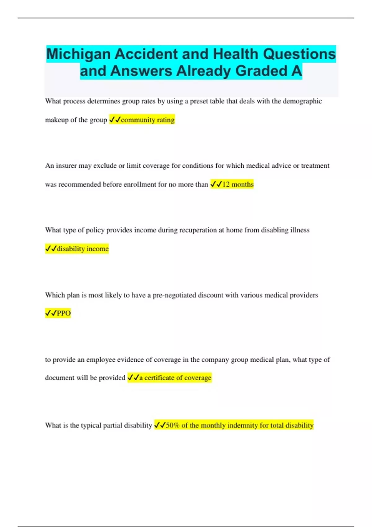 Michigan Accident and Health Questions and Answers Already Graded A What process determines group rates by using a preset table that deals with the demographic makeup of the group community rating An insurer may exclude or limit coverage for conditions for which medical advice or treatment was recommended before enrollment for no more than 12 months What type of policy provides income during recuperation at home from disabling illness disability income Which plan is most likely to have a pre-negotiated discount with various medical providers PPO to provide an employee evidence of coverage in the company group medical plan, what type of document will be provided a certificate of coverage What is the typical partial disability 50% of the monthly indemnity for total disability for a non-contributory plan, how many of the employees must be offered coverage under the group 100% All of the following are true regarding comprehensive dental plans EXCEPT benefits are paid on a first-dollar basis true: -coinsurance -duductibles -also referred to as nonscheduled After a group disability insurance policy is approved by the Commissioner, what is issued Certificate of coverage a change of occupation provision will allow the insurance company to do any o fthe following at the time of claim, EXCEPT: increase the premiums for the individual ALLOW: -pay the benefits stated in the policy -pay a reduced benefit for a higher risk occupation -require a doctor's statment cofirming disability When completing an application for insurance, an agent is allowed to do... witness the applicant's signature Not an example of a limited policy universal