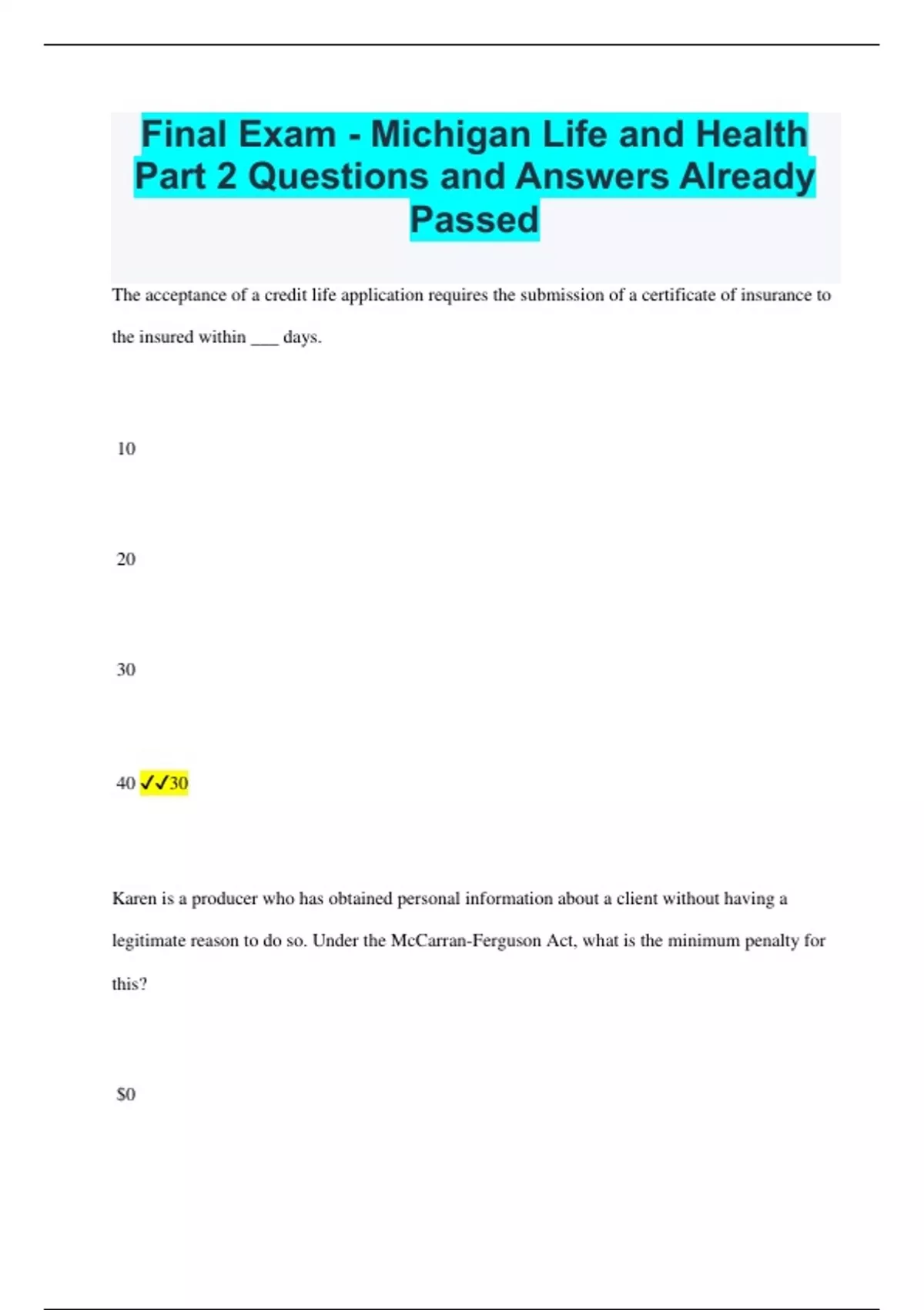 Final Exam - Michigan Life and Health Part 2 Questions and Answers Already Passed The acceptance of a credit life application requires the submission of a certificate of insurance to the insured within ___ days. 10 20 30 40 30 Karen is a producer who has obtained personal information about a client without having a legitimate reason to do so. Under the McCarran-Ferguson Act, what is the minimum penalty for this? $0 $5,000 $10,000 $15,000 $10,000 Which of these factors is NOT taken into consideration when determining the cost of a long-term care policy? Health of applicant Amount of benefits provided Age of applicant Personal income Personal income Life insurance policies will normally pay for losses arising from commercial aviation war suicide hazardous jobs commercial aviation Which type of clause describes the following statement: "We have issued the policy in consideration of the representations in your applications and payment of the first-term premium". Premium clause Consideration clause Adhesion clause Contestability clause Consideration clause Which of these will typically authorize treatment from a specialist? Administrator Policyowner Insurance company Gatekeeper Gatekeeper Which of these is affected by the frequency of an insurance