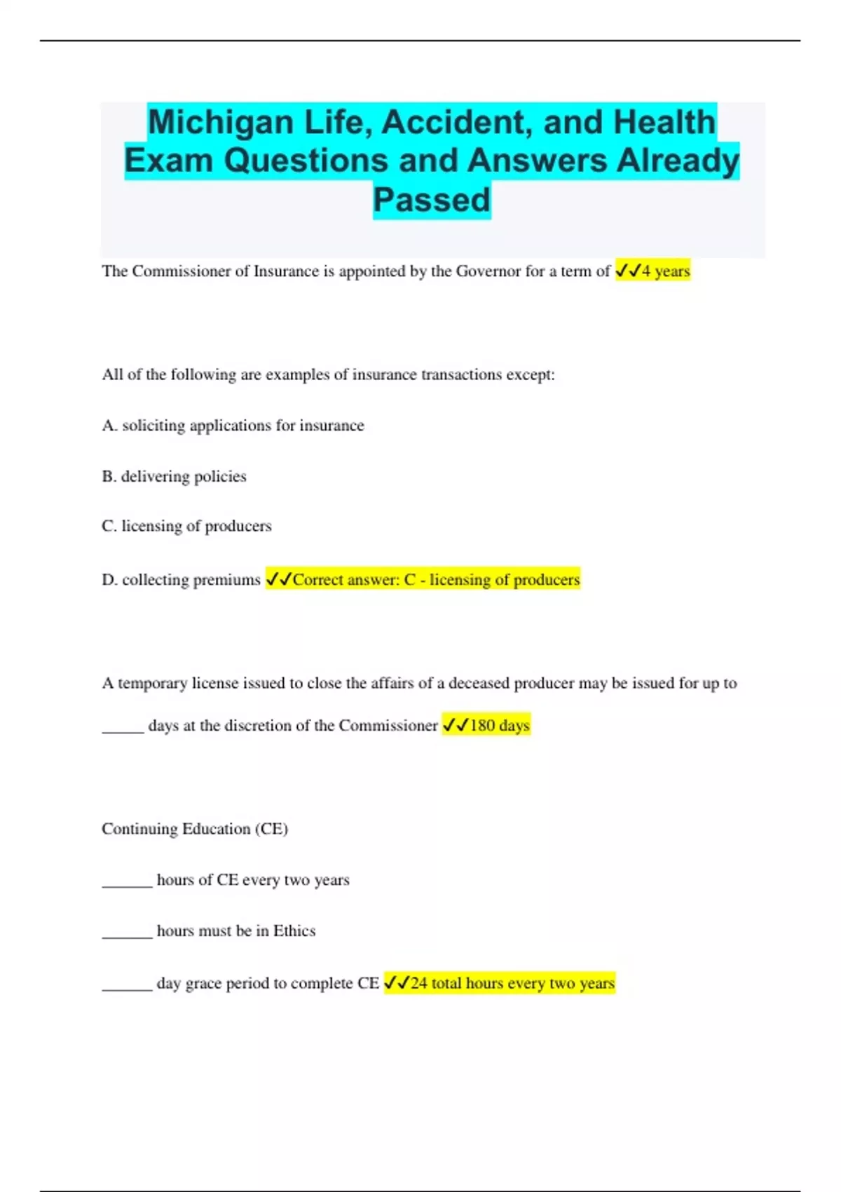 Michigan Life, Accident, and Health Exam Questions and Answers Already Passed