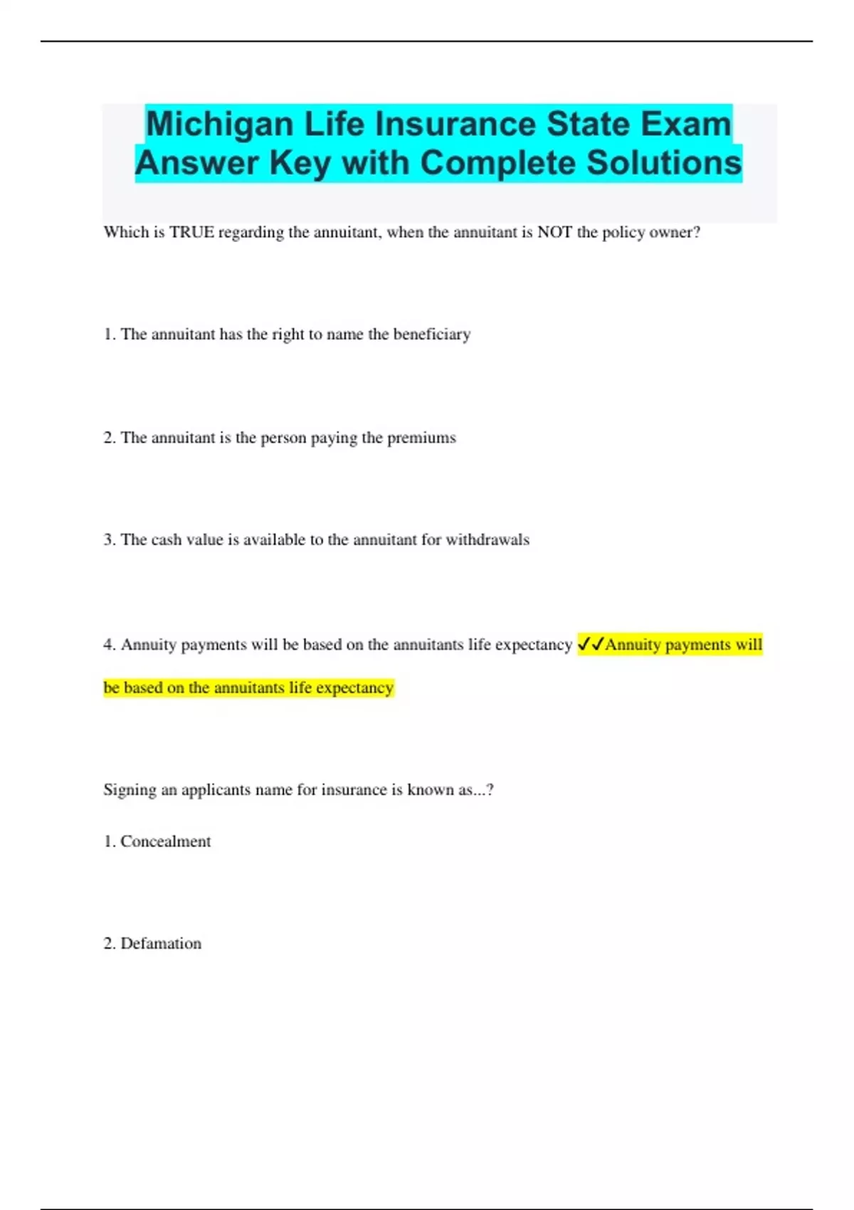 Michigan Life Insurance State Exam Answer Key with Complete Solutions Which is TRUE regarding the annuitant, when the annuitant is NOT the policy owner? 1. The annuitant has the right to name the beneficiary 2. The annuitant is the person paying the premiums 3. The cash value is available to the annuitant for withdrawals 4. Annuity payments will be based on the annuitants life expectancy Annuity payments will be based on the annuitants life expectancy Signing an applicants name for insurance is known as...? 1. Concealment 2. Defamation 3. Coercion 4. Forgery 4. Forgery Failure to pay a penalty assessed by the commissioner may result in...? 1. Revoked or suspended license 2. Require the license to retake the examination 3. Complete 5 extra hours of continuing education 4. Pay a late charge of 1.5% 1. Revoked or suspended license Two business business partners own life insurance, which or the following allows the surviving partner to use death benefit to purchase the deceased owners share? 1. Buy-sell agreement 2. Key employee life insurance 3. Business continuation 4. Accidental death 1. Buy-sell agreement Policy owner surrenders a policy for