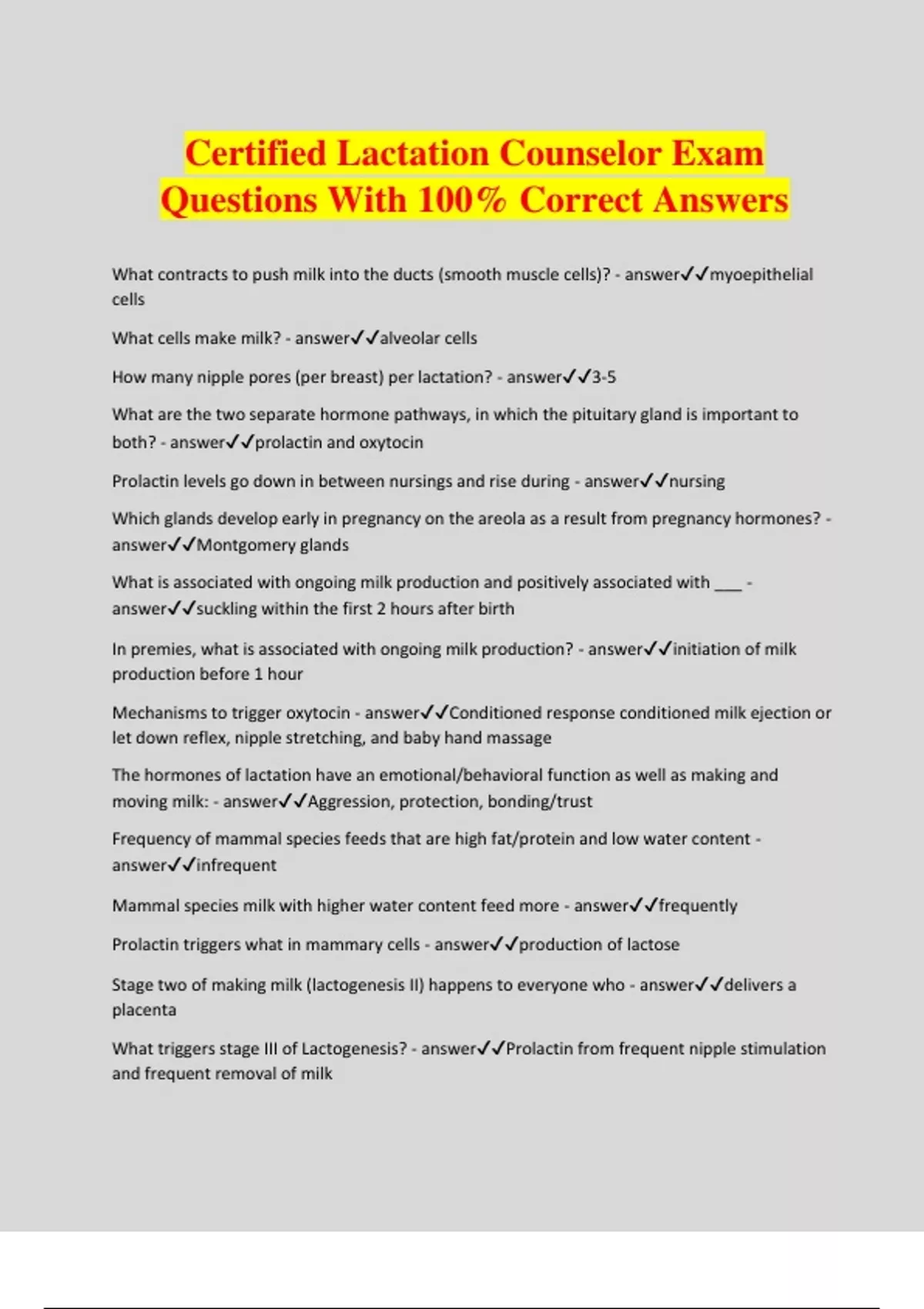 Certified Lactation Counselor Exam Questions With 100% Correct Answers What contracts to push milk into the ducts (smooth muscle cells)? - answermyoepithelial cells What cells make milk? - answeralveolar cells How many nipple pores (per breast) per lactation? - answer3-5 What are the two separate hormone pathways, in which the pituitary gland is important to both? - answerprolactin and oxytocin Prolactin levels go down in between nursings and rise during - answernursing Which glands develop early in pregnancy on the areola as a result from pregnancy hormones? - answerMontgomery glands What is associated with ongoing milk production and positively associated with ___ - answersuckling within the first 2 hours after birth In premies, what is associated with ongoing milk production? - answerinitiation of milk production before 1 hour Mechanisms to trigger oxytocin - answerConditioned response conditioned milk ejection or let down reflex, nipple stretching, and baby hand massage The hormones of lactation have an emotional/behavioral function as well as making and moving milk: - answerAggression, protection, bonding/trust Frequency of mammal species feeds that are high fat/protein and low water content - answerinfrequent Mammal species milk with higher water content feed more - answerfrequently Prolactin triggers what in mammary cells - answerproduction of lactose Stage two of making milk (lactogenesis II) happens to everyone who - answerdelivers a placenta What triggers stage III of Lactogenesis? - answerProlactin from frequent nipple stimulation and frequent removal of milk Prolactin draws what - answerwater Preterm milk appears to be higher in what as compared to mature milk? - answerprotein, fat, electrolytes After one year of lactation, human milk expressed has significantly increased ___ contents, compared with milk expressed by women lactation for a shorter time - answerfat/energy What does faster milk removal increase? - answerfat content What influences amount of fat transferred? - answerdegree of breast emptying, amount of available milk, breast storage capacity Longer the time between feedings, what is decreased? - answerfat content Three scenarios when breastmilk composition changes: - answerover the course of lactation, within the day, within a feeding The breast fed baby can regulate his fat intake quickly and thus mothers should be encouraged to practice baby led feeding which means - answercues from baby If a higher calorie content is needed for a specific preterm infant, what time of day samples should preferably be given? - answerevening pH of the gut of the breastfed babies is more - answeracidic Iron content in human milk is relatively (low/high? - answerlow Presence of bifidus factor in the milk which promotes the intestinal presence of lactobacillus bifidus does what - answermaintain low pH and crowd out pathogenic organisms Presence of hormones, hormone like factors, and growth factors that stimulate growth and development of the GI tract and GI motilit