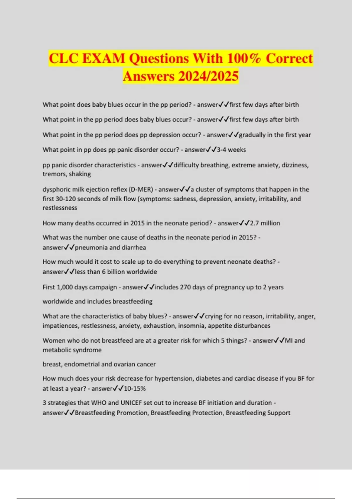 CLC EXAM Questions With 100% Correct Answers 2024/2025 What point does baby blues occur in the pp period? - answerfirst few days after birth What point in the pp period does baby blues occur? - answerfirst few days after birth What point in the pp period does pp depression occur? - answergradually in the first year What point in pp does pp panic disorder occur? - answer3-4 weeks pp panic disorder characteristics - answerdifficulty breathing, extreme anxiety, dizziness, tremors, shaking dysphoric milk ejection reflex (D-MER) - answera cluster of symptoms that happen in the first 30-120 seconds of milk flow (symptoms: sadness, depression, anxiety, irritability, and restlessness How many deaths occurred in 2015 in the neonate period? - answer2.7 million What was the number one cause of deaths in the neonate period in 2015? - answerpneumonia and diarrhea How much would it cost to scale up to do everything to prevent neonate deaths? - answerless than 6 billion worldwide First 1,000 days campaign - answerincludes 270 days of pregnancy up to 2 years worldwide and includes breastfeeding What are the characteristics of baby blues? - answercrying for no reason, irritability, anger, impatiences, restlessness, anxiety, exhaustion, insomnia, appetite disturbances Women who do not breastfeed are at a greater risk for which 5 things? - answerMI and metabolic syndrome breast, endometrial and ovarian cancer How much does your risk decrease for hypertension, diabetes and cardiac disease if you BF for at least a year? - answer10-15% 3 strategies that WHO and UNICEF set out to increase BF initiation and duration - answerBreastfeeding Promotion, Breastfeeding Protection, Breastfeeding Support 2x more likely when all 3 are present breastfeeding promotion according to WHO and UNICEF - answerfocuses on advantages of breastfeeding on a personal, community, country or global level breastfeeding protection - answerfocuses on govt, manufacturer and social responsibility to assure breastfeeding's ability to compete with commercial interests, addresses improper marketing practices, breastfeeding in public breastfeeding support - answerinteraction of helpers with family as well as program development and implementation why is BF so difficult that moms need help? - answer#1-unrealistic expectations #2-lack of timely interventions When do moms usually quit breastfeeding? - answer10 days following d/c International Code of Marketing Breastmilk Substitutes - answerinternational health policy framework to regulate the marketing of breastmilk substitutes to protect breastfeeding published by WHO written in response to marketing activities that were promoting formula feeding over breastfeeding World Breastfeeding Trends Initiative is intended to - answertrack, assess, and monitor the implementation of the global strategy at the country and sub country level what contributes to low rates of exclusive breastfeeding globally? - answercaregiver and societal beliefs favoring mixed feeding hospital practices and policies that don't support breastfeeding lack of support aggressive promotion of formula or substitutes inadequate maternity leave lack of knowledge How to support exclusive breastfeeding - answerIncrease hospital and health system capacity including revitalizing, expanding, and institutionalizing the baby-friendly hospital initiative in health systems Provide community based strategies including communication campaigns tailored to the local context Strengthen the monitoring, enforcement, and legislation related to "The Code" and subsequent resolutions. Enact at least 6 months paid maternity leave Invest in training and capacity building in breastfeeding protection, promotion, and support Alveoli - answermilk producing cells nipple ducts have how many pores - answer3-5 do all humans have prolactin? - answeryes! what 2 hormone pathways are involved in making milk? - answeroxytocin and prolactin prolactin levels - answerdependent on nipple stimulation (stroking) not decreased by stress go up and down in between nursing Oxytocin - answerinfluenced by nipple stretching (proper latch) temporarily affected by stress Feeding within the first 2 hours of life can do what to milk - answersignificantly increase milk supply by day 4 Receivers of Knowledge believe - answerBelieve all Authority tells the truth like to learn the right answer and repeat it to the teacher focus on teaching the right way and do return demo Subjective Knowers - answerKnowers who