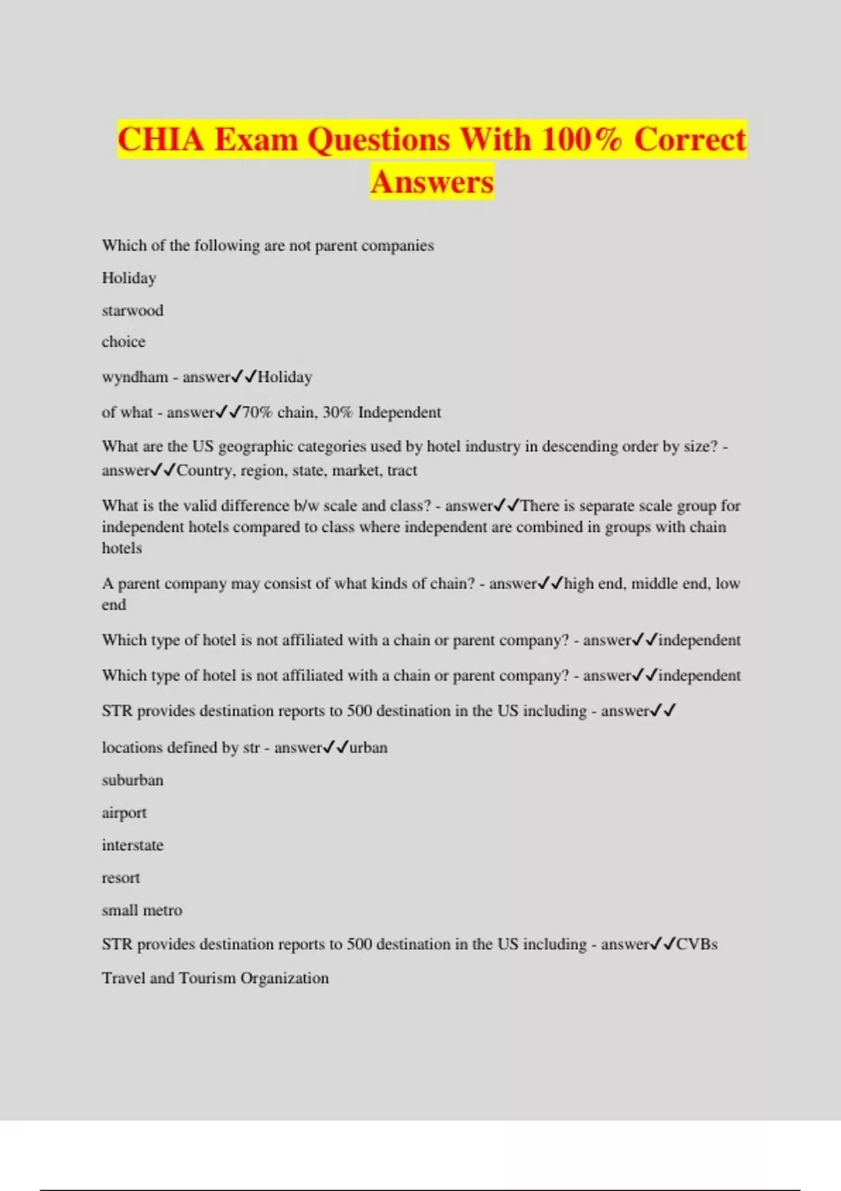 CHIA Exam Questions With 100% Correct Answers Which of the following are not parent companies Holiday starwood choice wyndham - answerHoliday of what - answer70% chain, 30% Independent What are the US geographic categories used by hotel industry in descending order by size? - answerCountry, region, state, market, tract What is the valid difference b/w scale and class? - answerThere is separate scale group for independent hotels compared to class where independent are combined in groups with chain hotels A parent company may consist of what kinds of chain? - answerhigh end, middle end, low end Which type of hotel is not affiliated with a chain or parent company? - answerindependent Which type of hotel is not affiliated with a chain or parent company? - answerindependent STR provides destination reports to 500 destination in the US including - answer locations defined by str - answerurban suburban airport interstate resort small metro STR provides destination reports to 500 destination in the US including - answerCVBs Travel and Tourism Organization DMOs Geographic subdivisions of a market are called - answerTract Which type of hotel is not affiliated with a chain or parent company? - answerindependent Supply ( rooms available) - answernumber of rooms X days in mth/yr Revenue - answerTotal roomrev from sale of rooms ADR x Occupancy KPIs - answeroccupancy %, ADR, Revpar Occupancy % - answer% of available rooms sold in time period Demand # rooms sold/ supply # rooms available ADR - answerAvg rate paid for rooms sold during period room rev/ demand rooms sold Revpar - answermeasure of rev by each room available- Affected by ant of unoccupied rooms room rev/ # rooms available Percent change - answercomparison of this years numbers vs last years numbers- shows growth (this yr- last yr) / last yr x 100 Comp Set has 4 +more participants submit actual data - answersufficient Multiple time period for monthly data include - answeryear to date running 12 month running 3 month multiple time periods for daily data include - answercurrent week, month to date, running 28 day index numbers - answercompare performance of property to comp set <100- outperformed comp set >100- comp set outperformed hotel When hotel in comp set doesn't report data - answerparticipating properties data used to calculate sample d
