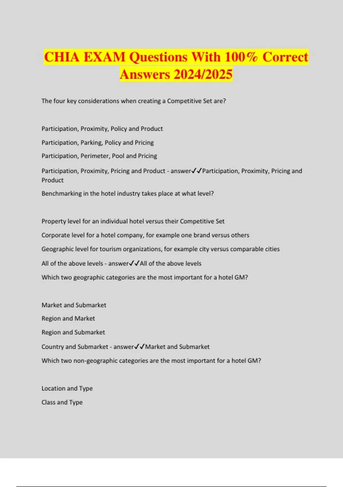 CHIA EXAM Questions With 100% Correct Answers 2024/2025 The four key considerations when creating a Competitive Set are? Participation, Proximity, Policy and Product Participation, Parking, Policy and Pricing Participation, Perimeter, Pool and Pricing Participation, Proximity, Pricing and Product - answerParticipation, Proximity, Pricing and Product Benchmarking in the hotel industry takes place at what level? Property level for an individual hotel versus their Competitive Set Corporate level for a hotel company, for example one brand versus others Geographic level for tourism organizations, for example city versus comparable cities All of the above levels - answerAll of the above levels Which two geographic categories are the most important for a hotel GM? Market and Submarket Region and Market Region and Submarket Country and Submarket - answerMarket and Submarket Which two non-geographic categories are the most important for a hotel GM? Location and Type Class and Type Scale and Class Scale and Location - answerScale and Class How many Scale categories are there compared to Class categories? 6 Scale categories and 6 Class categories 6 Scale categories and 7 Class categories 7 Scale categories and 6 Class categories 7 Scale categories and 7 Class categories - answer7 Scale categories and 6 Class categories Which is a true statement regarding markets? Markets include hotels that are in big cities, not rural areas A country would never have more than 100 markets and never have less than 2 markets No market will ever cross country boundaries There is another name for Markets outside the U.S. - answerNo market will ever cross country boundaries Most of the entities below are classified as "Chains". Which one is a "Parent Company" consisting of multiple chains? Radisson Blu Hilton Worldwide Hampton Inn Holiday Inn Express - answerHilton Worldwide When can a competitive set be created? A competitive set may be created on the one year anniversary of a hotel's opening A competitive set may be created while the hotel is under construction A competitive set may be created