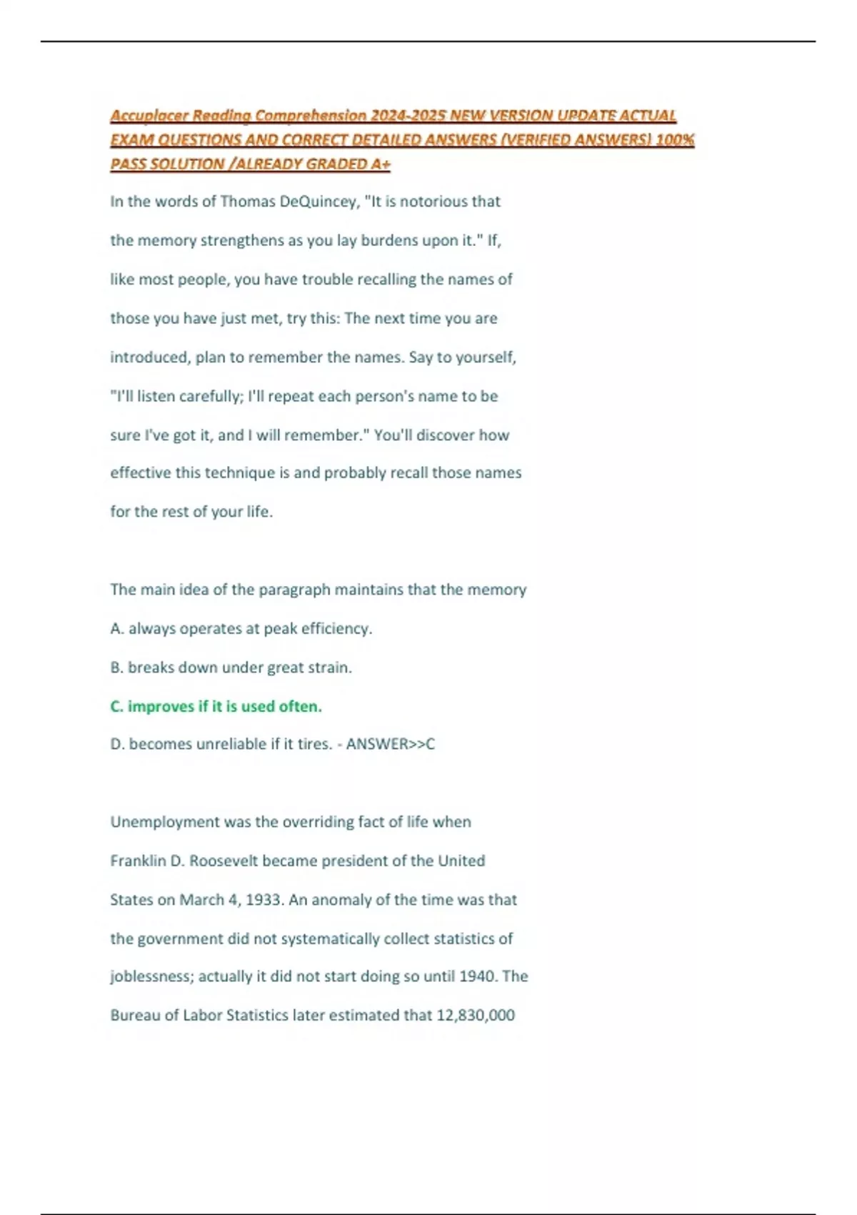Accuplacer Reading Comprehension NEW VERSION UPDATE ACTUAL EXAM QUESTIONS AND CORRECT DETAILED ANSWERS (VERIFIED ANSWERS) 100% PASS SOLUTION /ALREADY GRADED A+