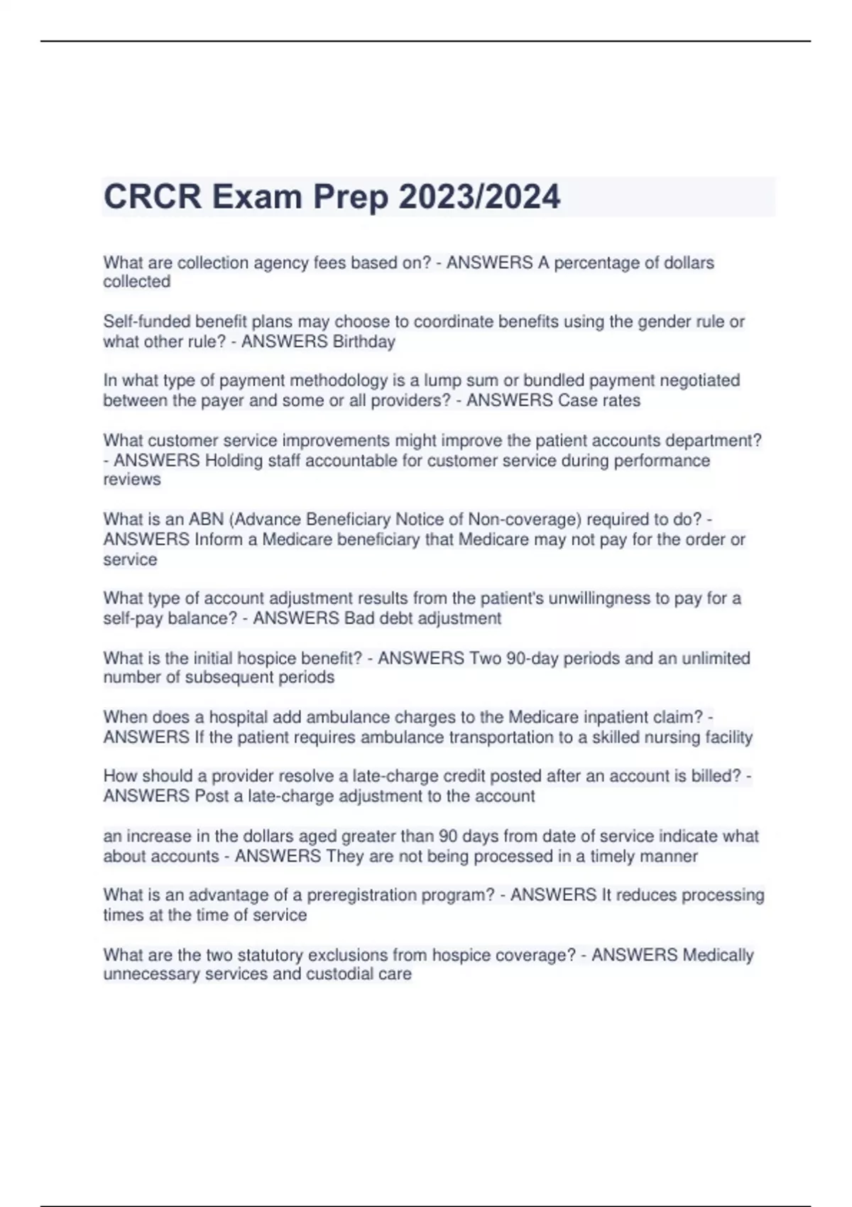CRCR Exam Prep 2023/2024 What are collection agency fees based on? - ANSWERS A percentage of dollars collected Self-funded benefit plans may choose to coordinate benefits using the gender rule or what other rule? - ANSWERS Birthday In what type of payment methodology is a lump sum or bundled payment negotiated between the payer and some or all providers? - ANSWERS Case rates What customer service improvements might improve the patient accounts department? - ANSWERS Holding staff accountable for customer service during performance reviews What is an ABN (Advance Beneficiary Notice of Non-coverage) required to do? - ANSWERS Inform a Medicare beneficiary that Medicare may not pay for the order or service What type of account adjustment results from the patient's unwillingness to pay for a self-pay balance? - ANSWERS Bad debt adjustment What is the initial hospice benefit? - ANSWERS Two 90-day periods and an unlimited number of subsequent periods When does a hospital add ambulance charges to the Medicare inpatient claim? - ANSWERS If the patient requires ambulance transportation to a skilled nursing facility How should a provider resolve a late-charge credit posted after an account is billed? - ANSWERS Post a late-charge adjustment to the account an increase in the dollars aged greater than 90 days from date of service indicate what about accounts - ANSWERS They are not being processed in a timely manner What is an advantage of a preregistration program? - ANSWERS It reduces processing times at the time of service What are the two statutory exclusions from hospice coverage? - ANSWERS Medically unnecessary services and custodial care What core financial activities are resolved within patient access? - ANSWERS Scheduling, insurance verification, discharge processing, and payment of point-ofservice receipts What statement applies to the scheduled outpatient? - ANSWERS The services do not involve an overnight stay How is a mis-posted contractual allowance resolved? - ANSWERS Comparing the contract reimbursement rates with the contract on the admittance advice to identify the correct amount What type of patient status is used to evaluate the patient's need for inpatient care? - ANSWERS Observation Coverage rules for Medicare beneficiaries receiving skilled nursing care require that the beneficiary has received what? - ANSWERS Medically necessary inpatient hospital services for at least 3 consecutive days before the skilled nursing care admission When is the word "SAME" entered on the CMS 1500 billing form in Field 0$? - ANSWERS When the patient is the insured What are non-emergency patients who come for service without prior notification to the provider called? - ANSWERS Unscheduled patients If the insurance verification response reports that a subscriber has a single policy, what is the status of the subscriber's spouse? - ANSWERS Neither enrolled not entitled to benefits Regulation Z of the Consumer Credit Protection Act, also known as the Truth in Lending Act, establishes what? - ANSWERS Disclosure rules for consumer credit sales and consumer loans What is a principal diagnosis? - ANSWERS Primary reason for the patient's admission Collecting patient liability dollars after service leads to what? - ANSWERS Lower accounts receivable levels What is the daily out-of-pocket amount for each lifetime reserve day used? - ANSWERS 50% of the current deductible amount What service provided to a Medicare beneficiary in a rural health clinic (RHC) is not billable as an RHC services? - ANSWERS Inpatient care What code indicates the disposition of the patient at the conclusion of service? - ANSWERS Patient discharge status code What are hospitals required to do for Medicare credit balance accounts? - ANSWERS They result in lost reimbursement and additional cost to collect When an undue delay of payment results from a dispute between the patient and the third party payer, who is responsible for payment? - ANSWERS Patient Medicare guidelines require that when a test is ordered for a LCD or NCD exists, the information provided on the order must include: - ANSWERS A valid CPT or HCPCS code With advances in internet security and encryption, revenue-cycle processes are expanding to allow patients to do what? - ANSWERS Access their information and perform functions on-line What date is required on all CMS 1500 claim forms? - ANSWERS onset date of current illness What does scheduling allow provider staff to do - ANSWERS Review appropriateness of the service request What code is used to report the provider's most common semiprivate room rate? - ANSWERS Condition cod
