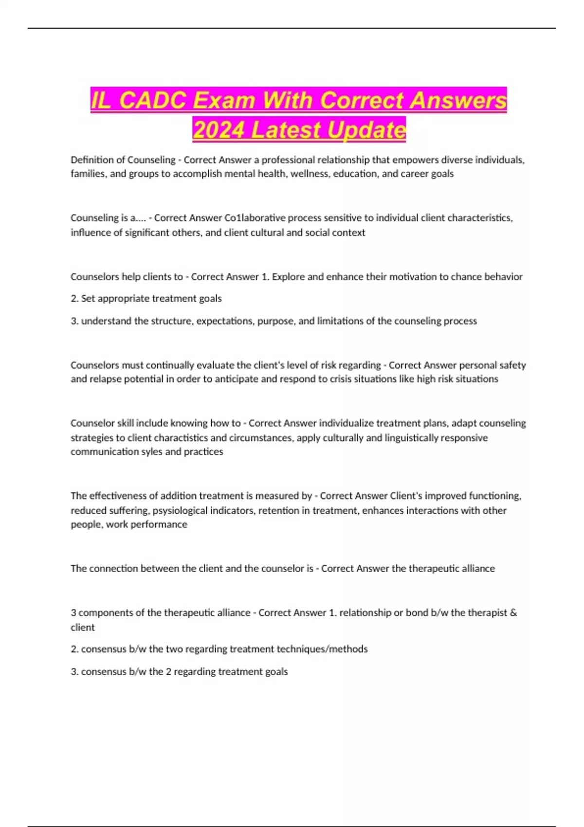 IL CADC Exam With Correct Answers 2024 Latest Update Definition of Counseling - Correct Answer a professional relationship that empowers diverse individuals, families, and groups to accomplish mental health, wellness, education, and career goals Counseling is a.... - Correct Answer Co1laborative process sensitive to individual client characteristics, influence of significant others, and client cultural and social context Counselors help clients to - Correct Answer 1. Explore and enhance their motivation to chance behavior 2. Set appropriate treatment goals 3. understand the structure, expectations, purpose, and limitations of the counseling process Counselors must continually evaluate the client's level of risk regarding - Correct Answer personal safety and relapse potential in order to anticipate and respond to crisis situations like high risk situations Counselor skill include knowing how to - Correct Answer individualize treatment plans, adapt counseling strategies to client charactistics and circumstances, apply culturally and linguistically responsive communication syles and practices The effectiveness of addition treatment is measured by - Correct Answer Client's improved functioning, reduced suffering, psysiological indicators, retention in treatment, enhances interactions with other people, work performance The connection between the client and the counselor is - Correct Answer the therapeutic alliance 3 components of the therapeutic alliance - Correct Answer 1. relationship or bond b/w the therapist & client 2. consensus b/w the two regarding treatment techniques/methods 3. consensus b/w the 2 regarding treatment goals