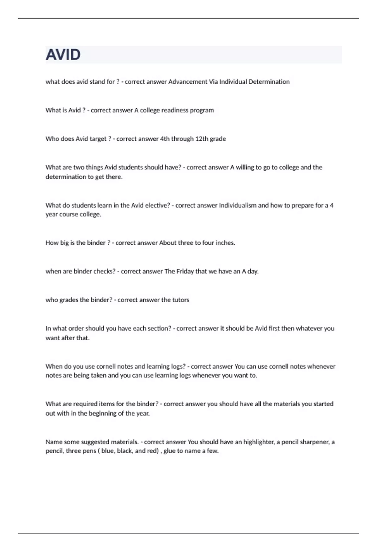 what does avid stand for ? - correct answer Advancement Via Individual Determination What is Avid ? - correct answer A college readiness program Who does Avid target ? - correct answer 4th through 12th grade What are two things Avid students should have? - correct answer A willing to go to college and the determination to get there. What do students learn in the Avid elective? - correct answer Individualism and how to prepare for a 4 year course college. How big is the binder ? - correct answer About three to four inches. when are binder checks? - correct answer The Friday that we have an A day. who grades the binder? - correct answer the tutors In what order should you have each section? - correct answer it should be Avid first then whatever you want after that. When do you use cornell notes and learning logs? - correct answer You can use cornell notes whenever notes are being taken and you can use learning logs whenever you want to. What are required items for the binder? - correct answer you should have all the materials you started out with in the beginning of the year. Name some suggested materials. - correct answer You should have an highlighter, a pencil sharpener, a pencil, three pens ( blue, black, and red) , glue to name a few.