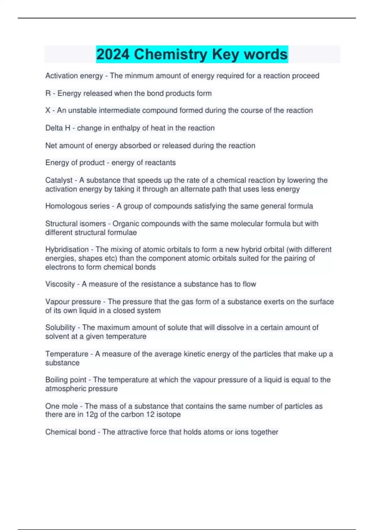 Activation energy - The minmum amount of energy required for a reaction proceed R - Energy released when the bond products form X - An unstable intermediate compound formed during the course of the reaction Delta H - change in enthalpy of heat in the reaction Net amount of energy absorbed or released during the reaction Energy of product - energy of reactants Catalyst - A substance that speeds up the rate of a chemical reaction by lowering the activation energy by taking it through an alternate path that uses less energy Homologous series - A group of compounds satisfying the same general formula Structural isomers - Organic compounds with the same molecular formula but with different structural formulae Hybridisation - The mixing of atomic orbitals to form a new hybrid orbital (with different energies, shapes etc) than the component atomic orbitals suited for the pairing of electrons to form chemical bonds Viscosity - A measure of the resistance a substance has to flow Vapour pressure - The pressure that the gas form of a substance exerts on the surface of its own liquid in a closed system Solubility - The maximum amount of solute that will dissolve in a certain amount of solvent at a given temperature Temperature - A measure of the average kinetic energy of the particles that make up a substance Boiling point - The temperature at which the vapour pressure of a liquid is equal to the atmospheric pressure One mole - The mass of a substance that contains the same number of particles as there are in 12g of the carbon 12 isotope Chemical bond - The attractive force that holds atoms or ions together