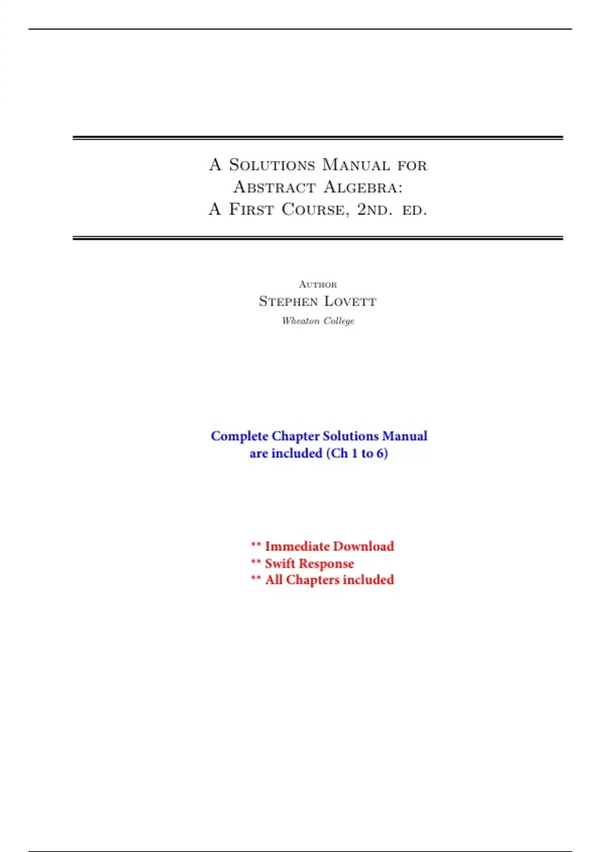 Complete Solutions Manual for Abstract Algebra, A First Course, 2nd Edition by Stephen Lovett ; ISBN13: 9781032289397. (Full Chapters included Chapter 1 to 6).... 1. Groups. 2. Quotient Groups. 3. Rings. 4. Divisibility in Integral Domains. 5. Field Extensions. 6. Topics in Group Theory.