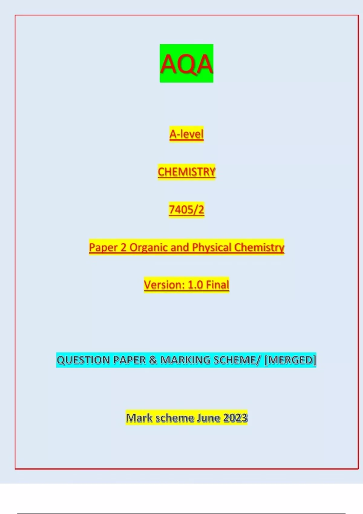 AQA A LEVEL CHEMISTRY 7405/2 PAPER 2 ORGANIC AND PHYSICAL CHEMISTRY VERSION 1.0 FINAL QUESTION PAPERS & MERGED MARKING SCHEME | JUNE 2023