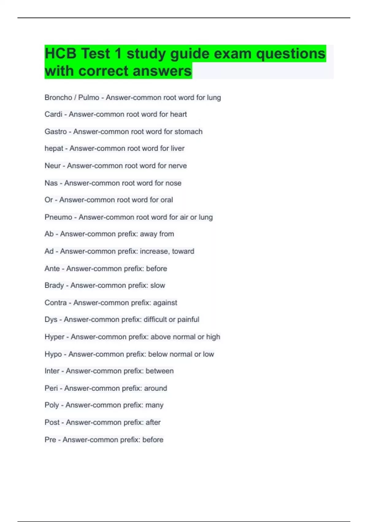 HCB Test 1 study guide exam questions with correct answers Ante - Answer-common prefix: before Brady - Answer-common prefix: slow Contra - Answer-common prefix: against Dys - Answer-common prefix: difficult or painful Hyper - Answer-common prefix: above normal or high Hypo - Answer-common prefix: below normal or low Inter - Answer-common prefix: between Peri - Answer-common prefix: around