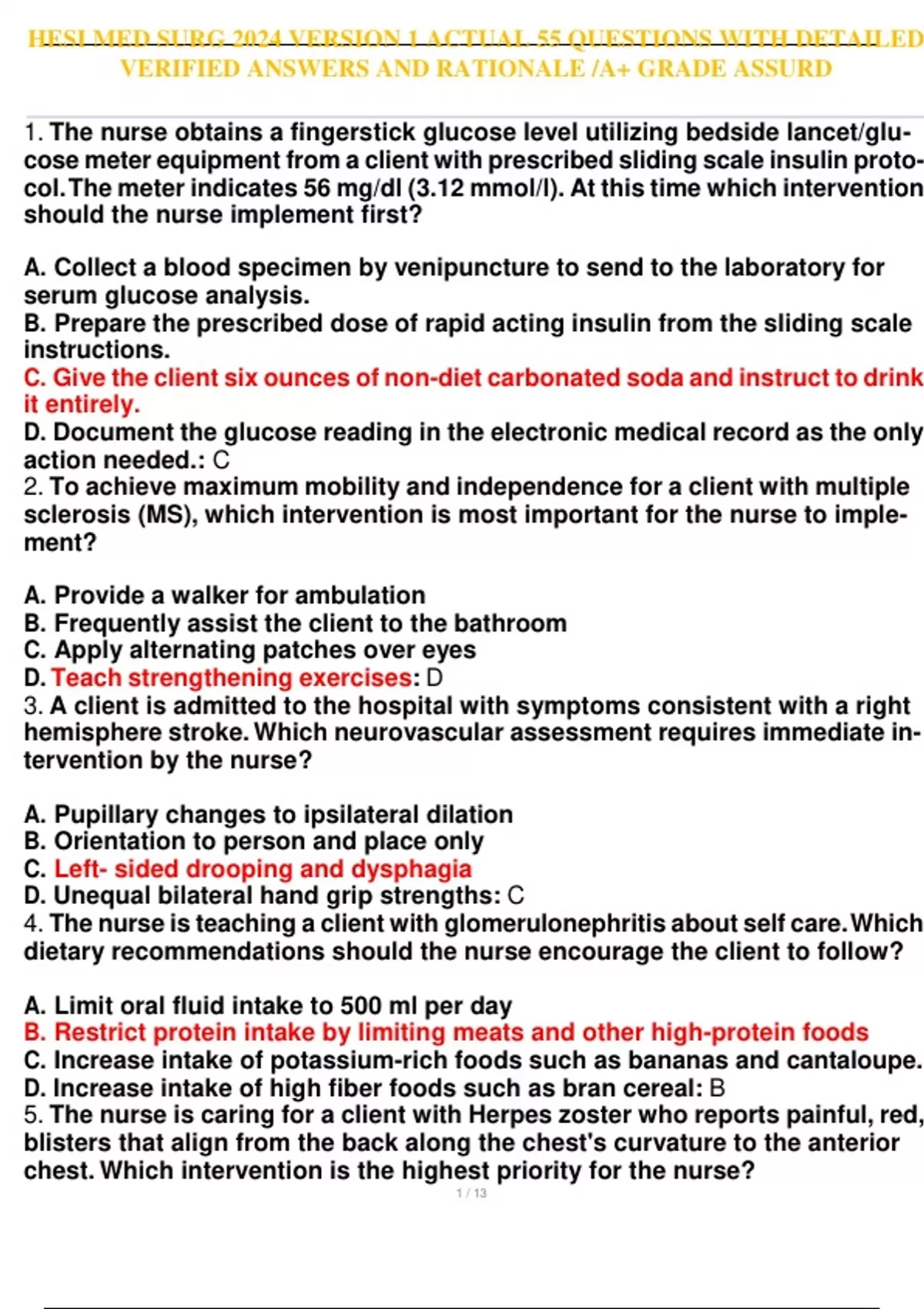 HESI MED SURG 2024 VERSION 1 ACTUAL 55 QUESTIONS WITH DETAILED VERIFIED ANSWERS AND RATIONALE /A+ GRADE ASSURD