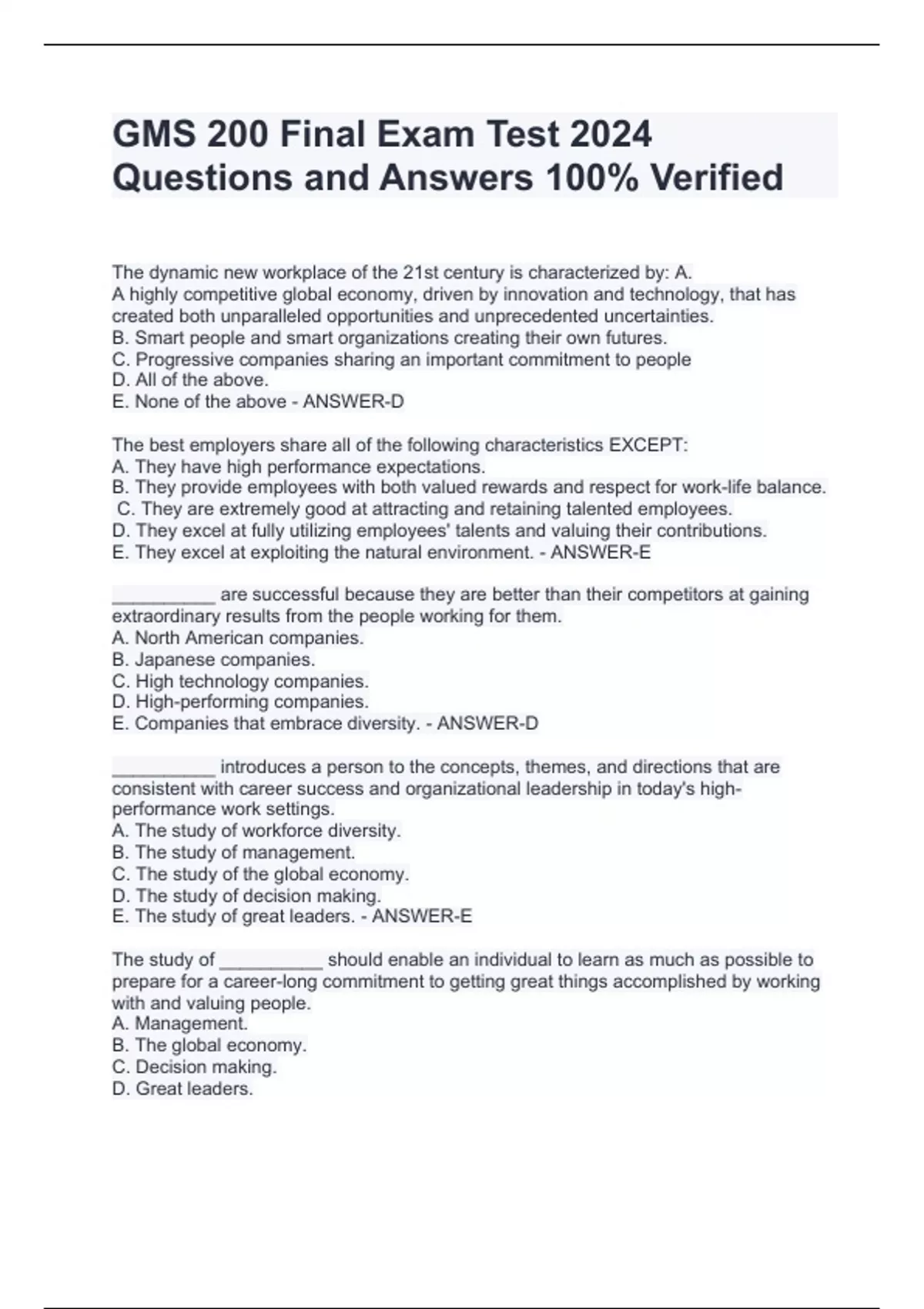 GMS 200 Final Exam Test 2024 Questions and Answers 100% Verified GMS 200 Final Exam Test 2024 Questions and Answers 100% Verified GMS 200 Final Exam Test 2024 Questions and Answers 100% Verified GMS 200 Final Exam Test 2024 Questions and Answers 100% Verified The dynamic new workplace of the 21st century is characterized by: A. A highly competitive global economy, driven by innovation and technology, that has created both unparalleled opportunities and unprecedented uncertainties. B. Smart people and smart organizations creating their own futures. C. Progressive companies sharing an important commitment to people D. All of the above. E. None of the above - ANSWER-D The best employers share all of the following characteristics EXCEPT: A. They have high performance expectations. B. They provide employees with both valued rewards and respect for work-life balance. C. They are extremely good at attracting and retaining talented employees. D. They excel at fully utilizing employees' talents and valuing their contributions. E. They excel at exploiting the natural environment. - ANSWER-E __________ are successful because they are better than their competitors at gaining
